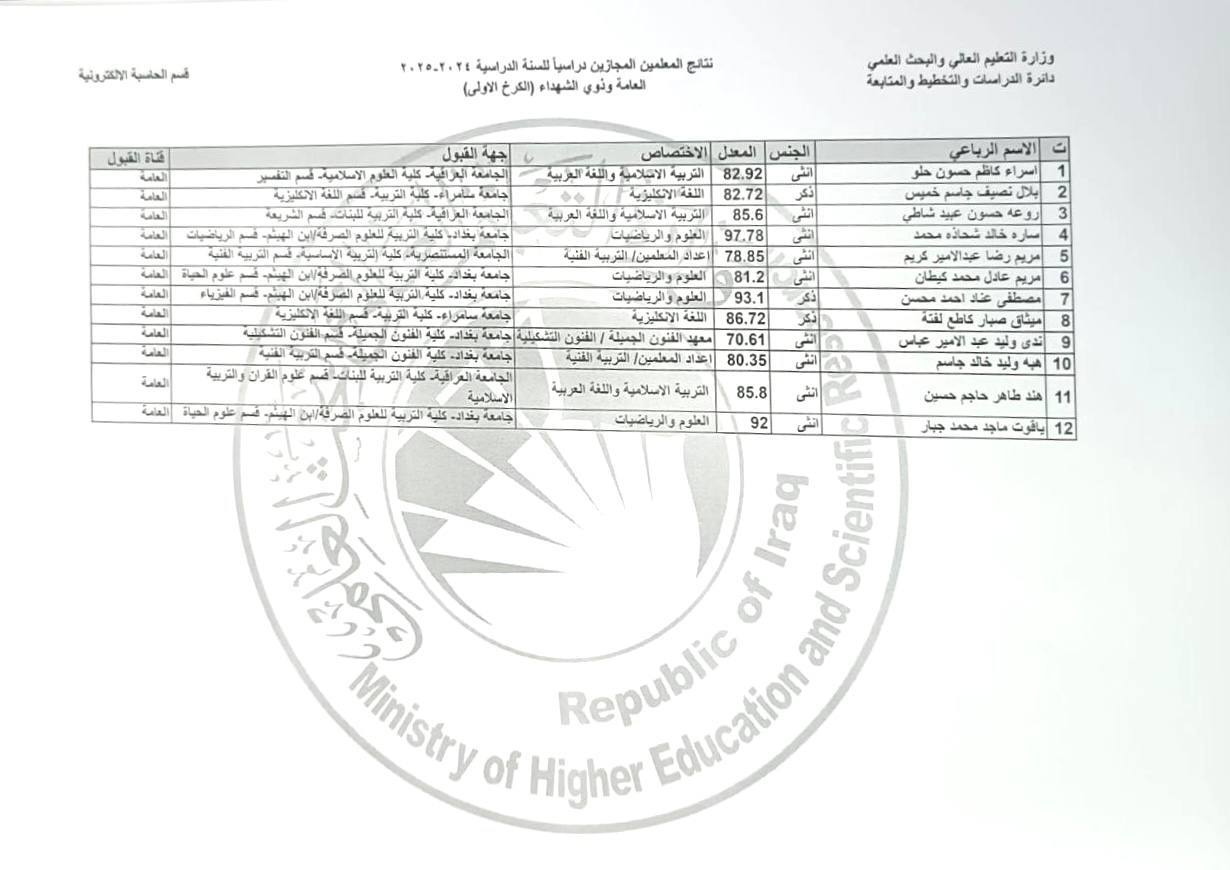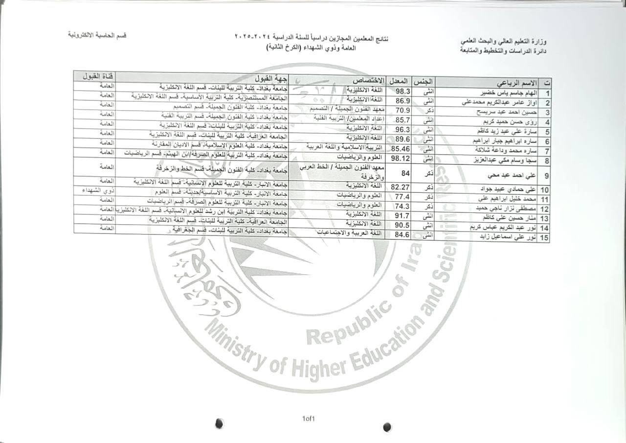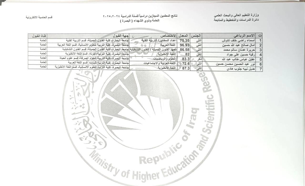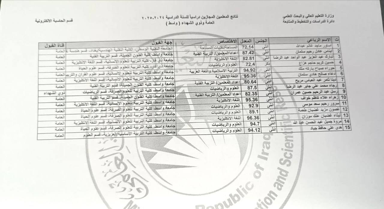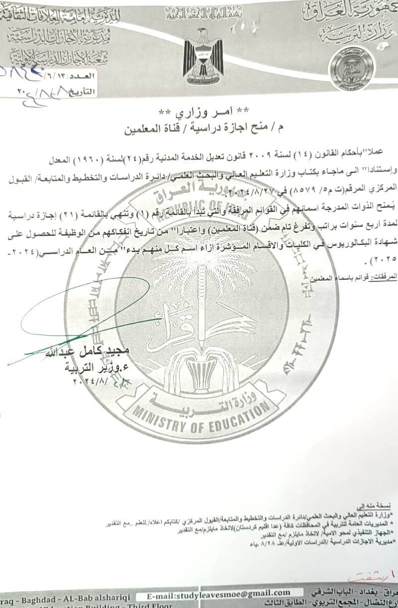 وقال بيان للوزارة، تلقت “النعيم نيوز” نسخة منه، “وزارة التربية/ المديرية العامة للعلاقات الثقافية/ مديرية الاجازات الدراسية، تعلن اسماء المتقدمين من المديريات العامة للتربية في بغداد والمحافظات كافة على ( قناة المعلمين ) ومنحهم اجازة دراسية لمدة اربع سنوات براتب وتفرغ تام لنيل شهادة البكالوريوس للعام الدراسي 2024-2025” …