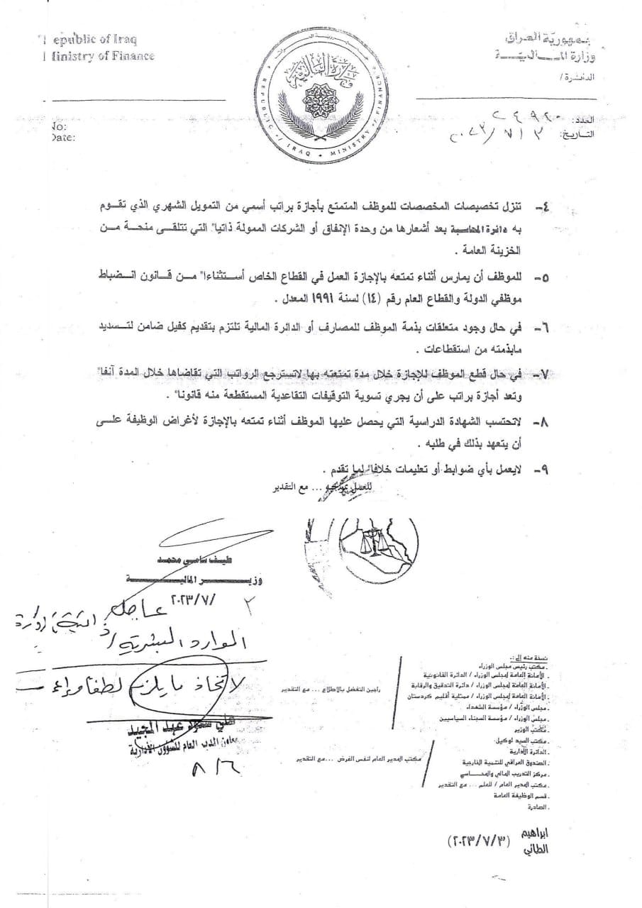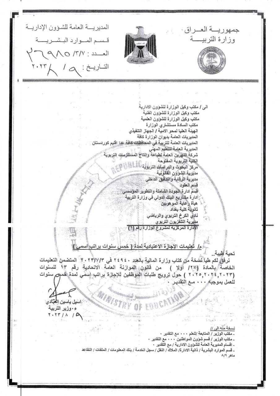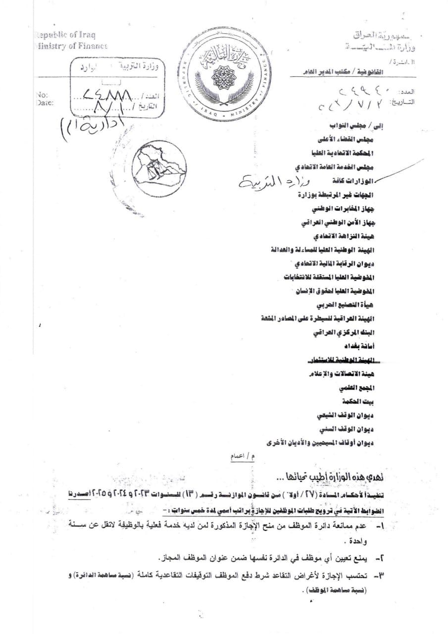 وأكد بيان للوزارة، تلقت “النعيم نيوز” نسخة منه، أن “الوزارة نشرت ضوابط الإجازة الاعتيادية لمدة خمس سنوات براتب إسمي لمنتسبيها الراغبين بالتقديم، وحسب قانون الموازنة العامة الاتحادية (2023-2024-2025)”.