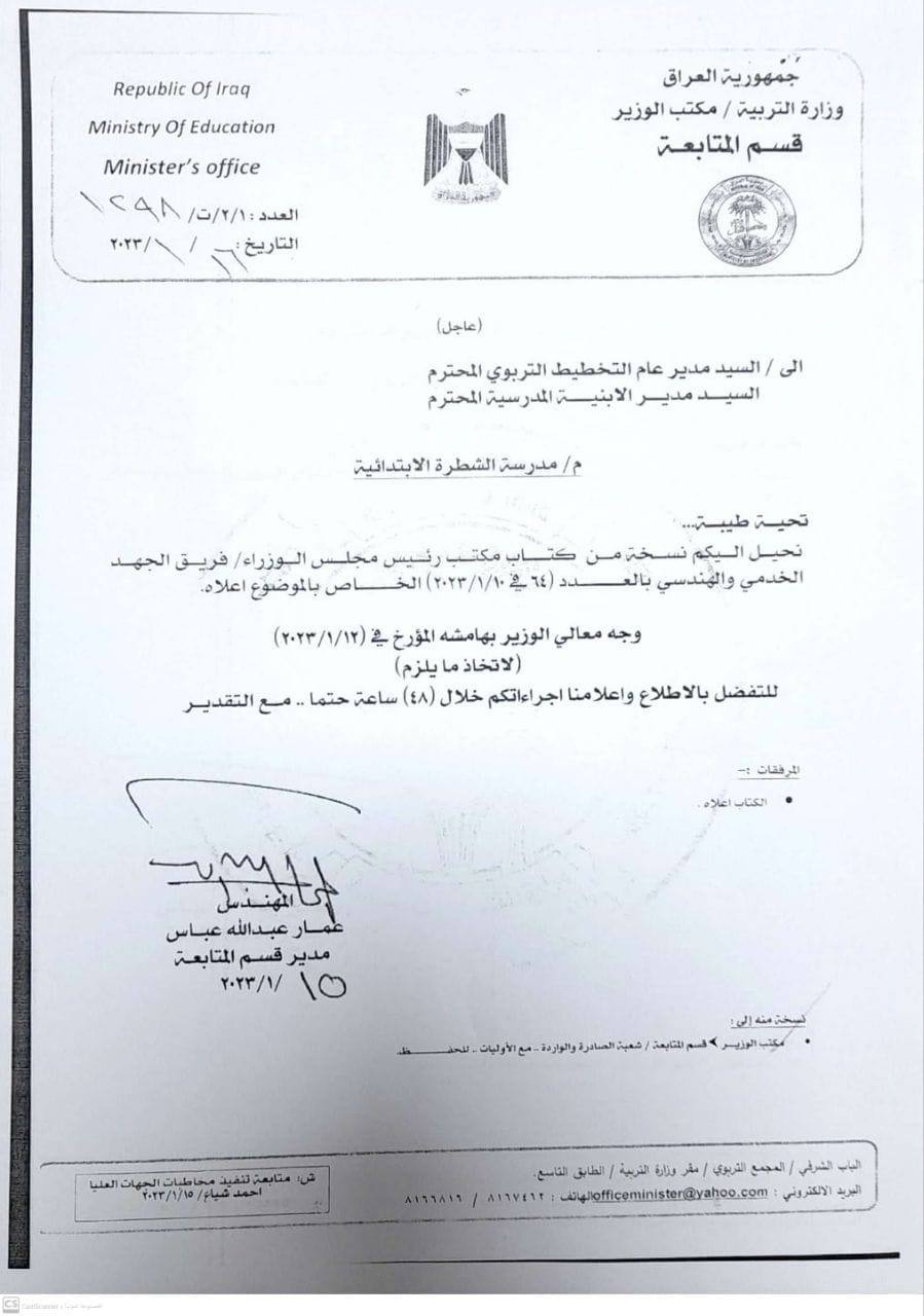 دعت مديرية التربية، اليوم الاثنين، لاتخاذ الاجراءات اللازمة بشأن مدرسة الشطرة الابتدائية.