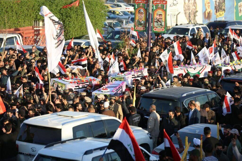وتابع”وقد انطلق موكب التشييع المهيب للجثامين الطاهرة للشهداء السعداء في منطقة شارع فلسطين وسط بغداد وسط تنديدات بالقصف الأميركي الغادر الذي مثل انتهاكا سافرا للسيادة العراقية”.