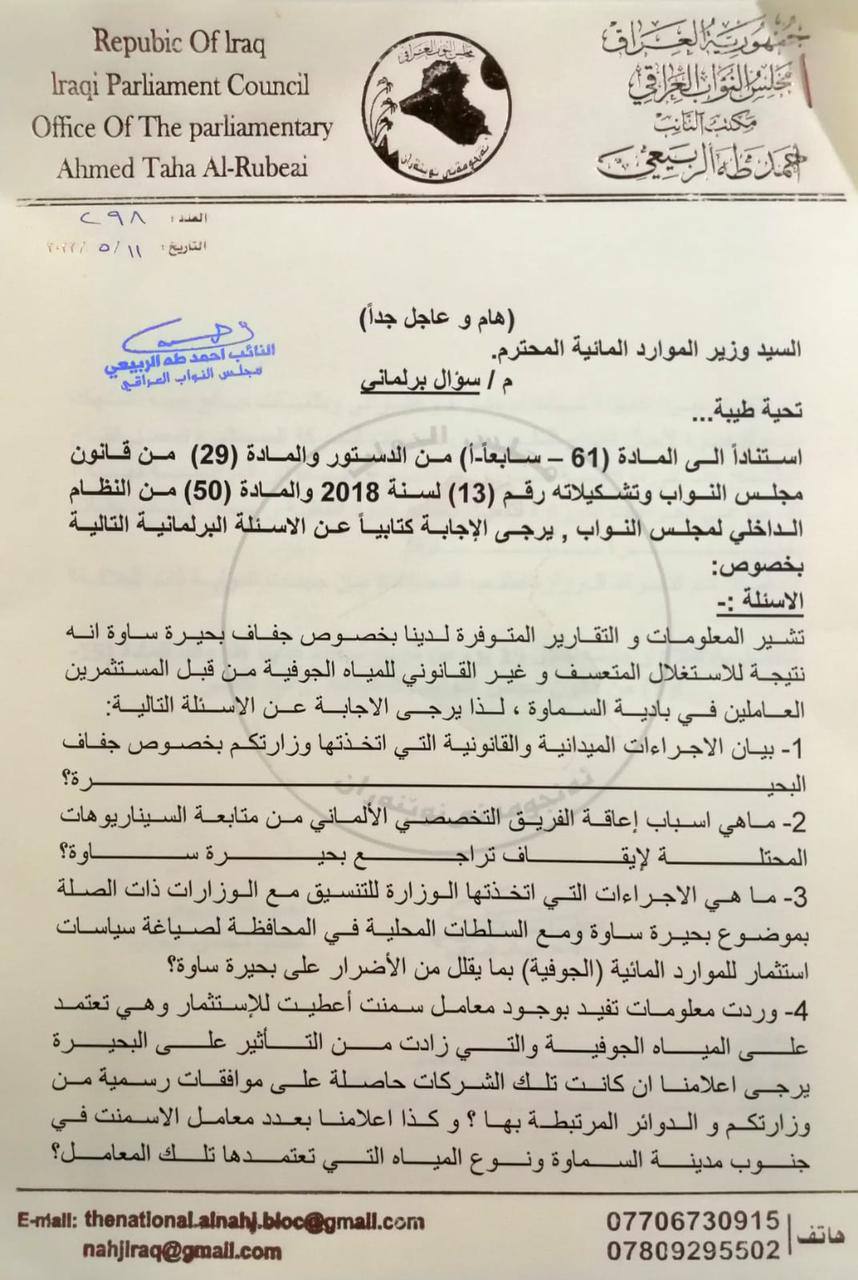 الربيعي يوجه أسئلة لوزارة الموارد المائية حول أسباب جفاف بحيرة ساوة (وثائق)