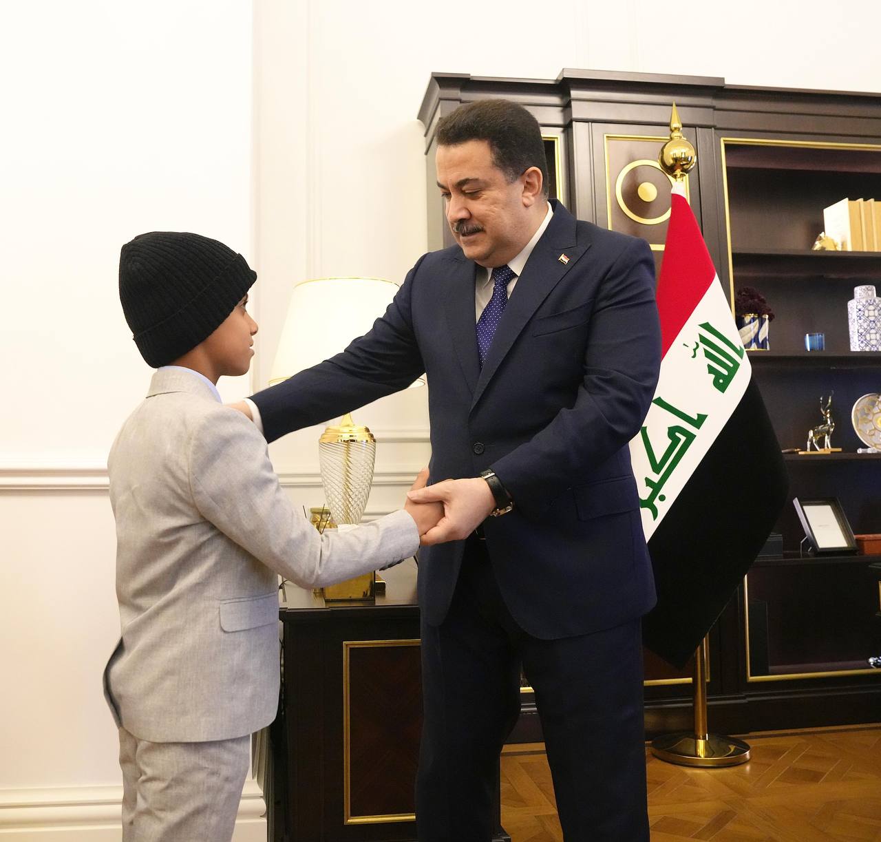 استقبل رئيس مجلس الوزراء، محمد شياع السوداني، اليوم الخميس، الطفل اليتيم المصاب عبد السلام، وهو من ضحايا الإرهاب البالغ من العمر 9 سنوات، يرافقه المواطن منهل أحمد عكلة، المتكفل برعايته.