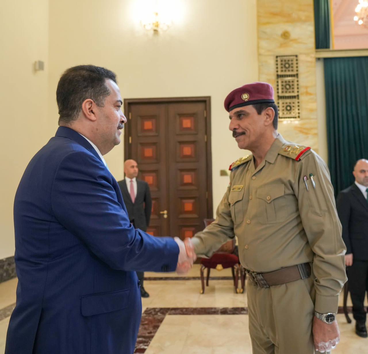 وذكر المكتب الإعلامي لرئيس مجلس الوزراء، في بيان تلقت “النعيم نيوز” نسخة منه، أن “القائد العام للقوات المسلحة محمد شياع السوداني، استقبل اليوم، المهنّئين بعيد الفطر المبارك، من القادة الأمنيين في وزارتي الدفاع والداخلية، وجهاز مكافحة الإرهاب، وجهاز الأمن الوطني، وجهاز المخابرات الوطني، وهيئة الحشد الشعبي، وقيادة العمليات المشتركة”.