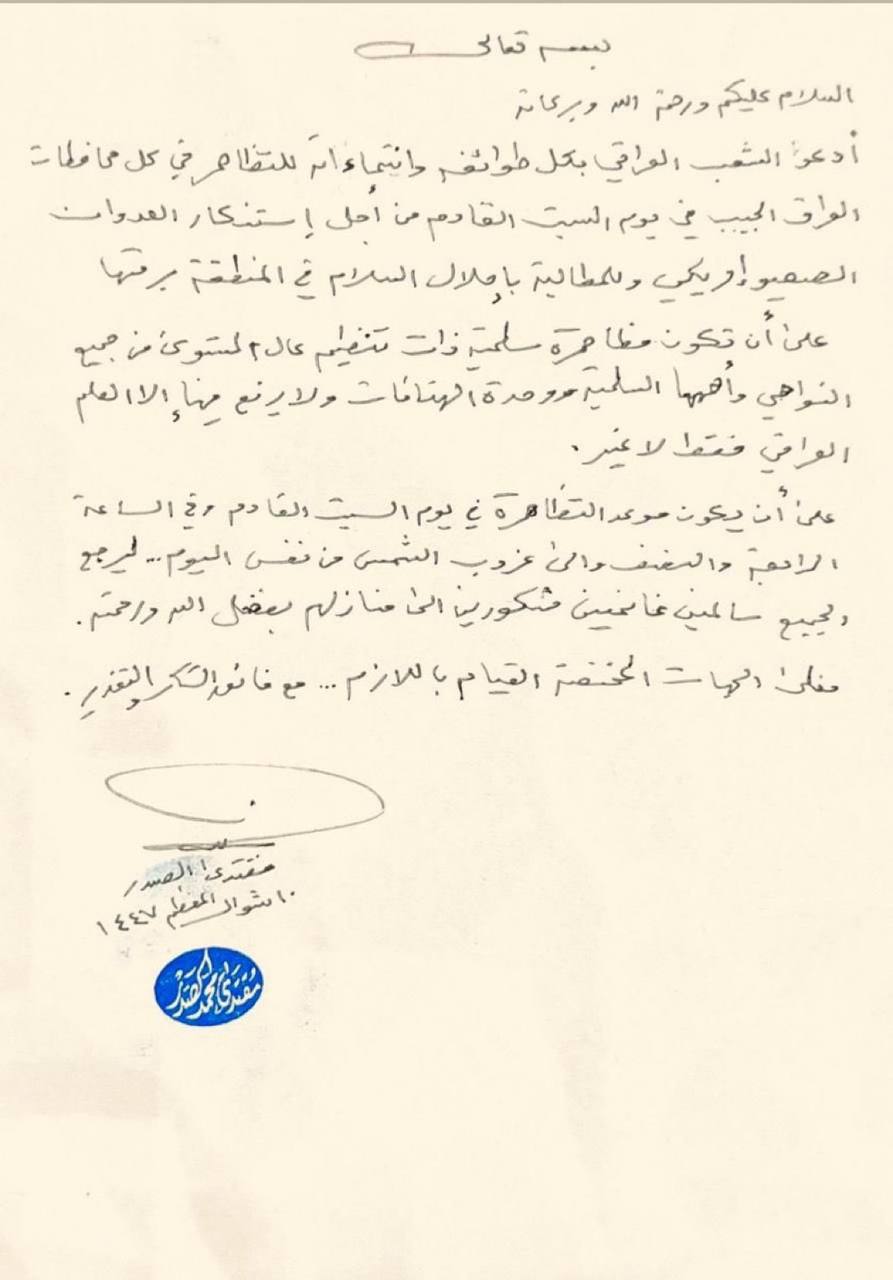 دعا زعيم التيار الوطني الشيعي، السيد مقتدى الصدر، اليوم الاثنين، إلى تنظيم تظاهرة السبت المقبل، في جميع محافظات البلاد.