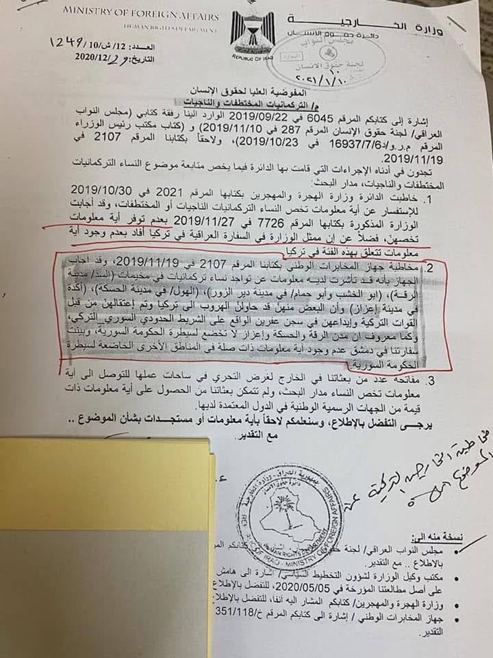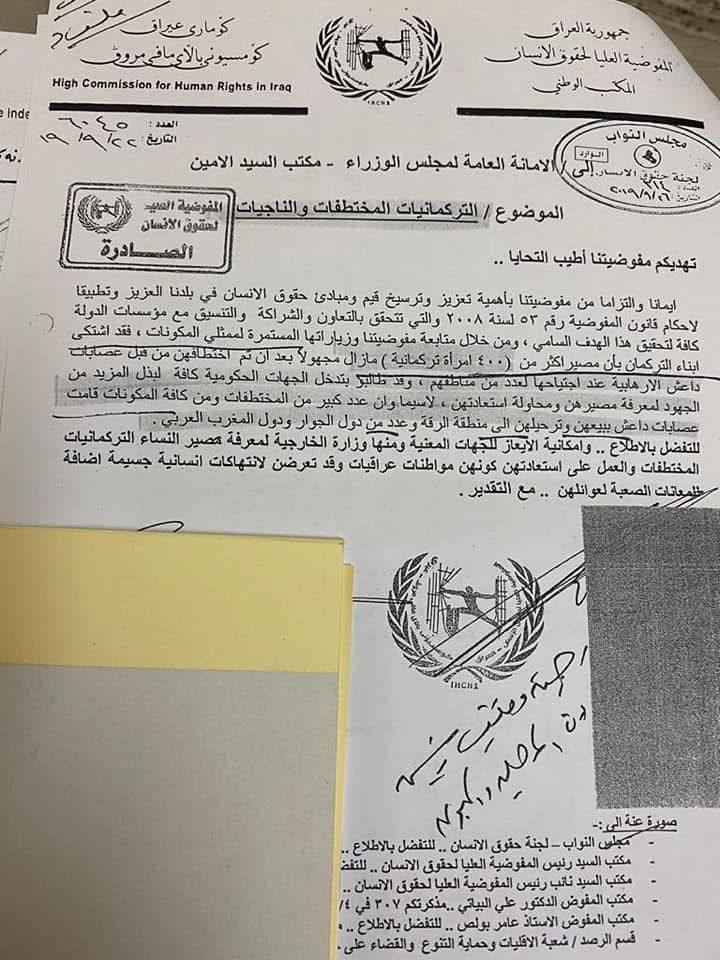 الصالحي يطالب القائد العام للقوات المسلحة بالتحقيق في مصير المختطفات التركمانيات