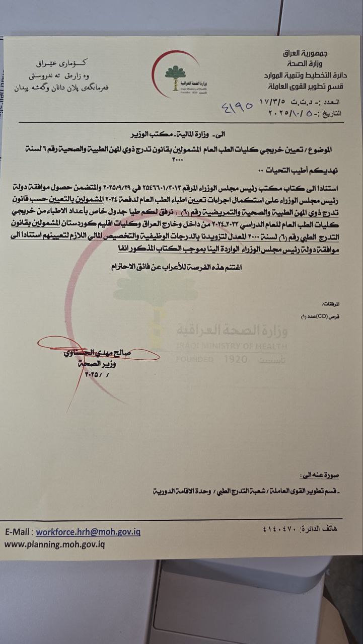 أعلن وزير الصحة، صالح مهدي الحسناوي، اليوم الأحد، أن رئيس مجلس الوزراء، وافق على استكمال إجراءات تعيين خريجي كليات الطب العام للدفعة 2024.