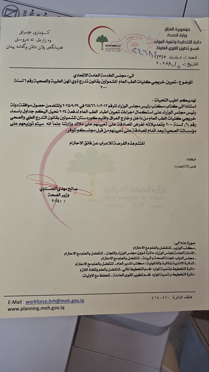 وأوضح بيان للوزارة، تلقت “النعيم نيوز” نسخة منه، أن “وزارة الصحة، استحصلت موافقة رئيس مجلس الوزراء، على استكمال إجراءات تعيين خريجي كليات الطب العام للدفعة 2024، المشمولين بقانون ذوي المهن الصحية والطبية رقم /6/ لسنة (2000)، الخريجين من داخل العراق أو خارجه، بما في ذلك إقليم كردستان، والذين تم استيعابهم وفق قانون التدرج الطبي”.