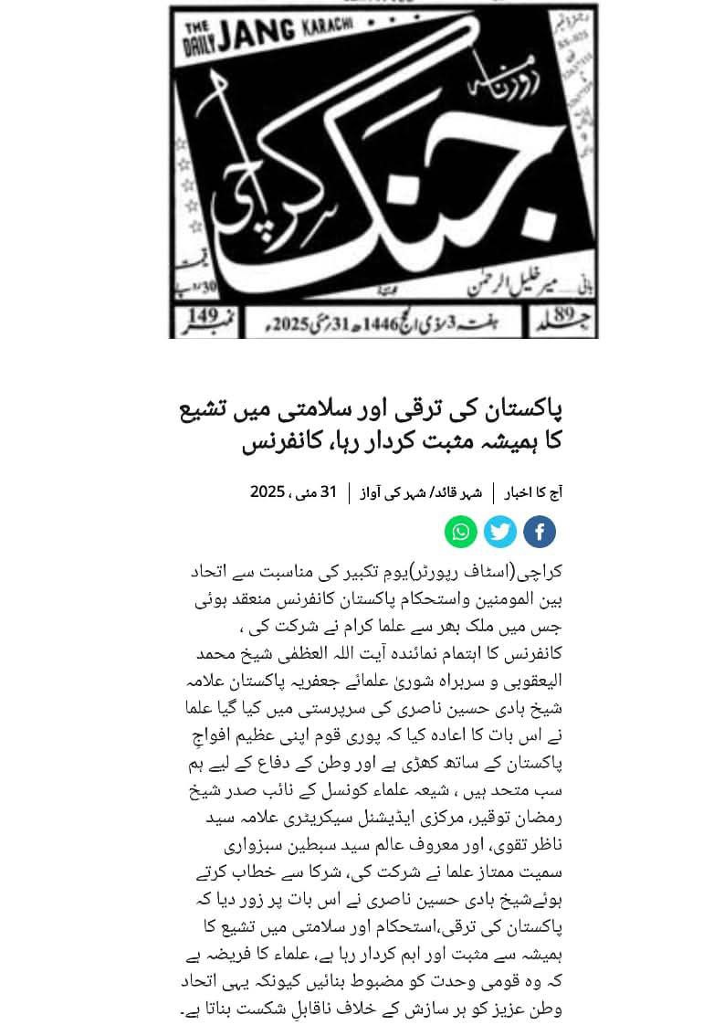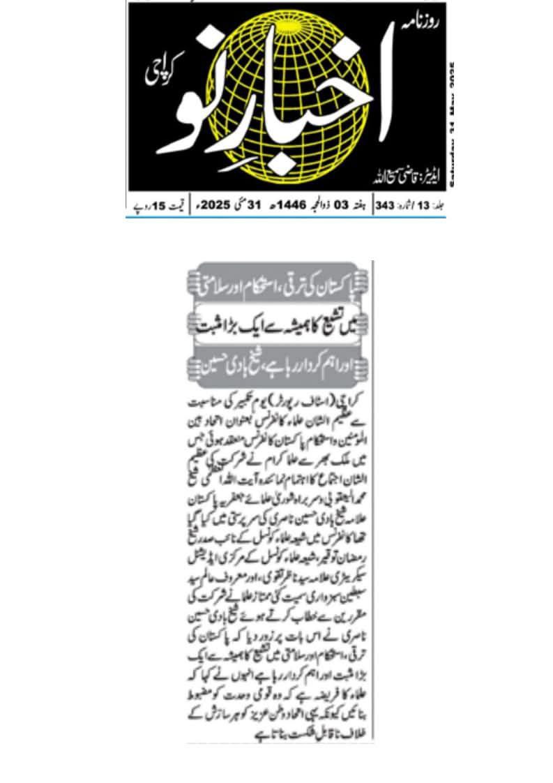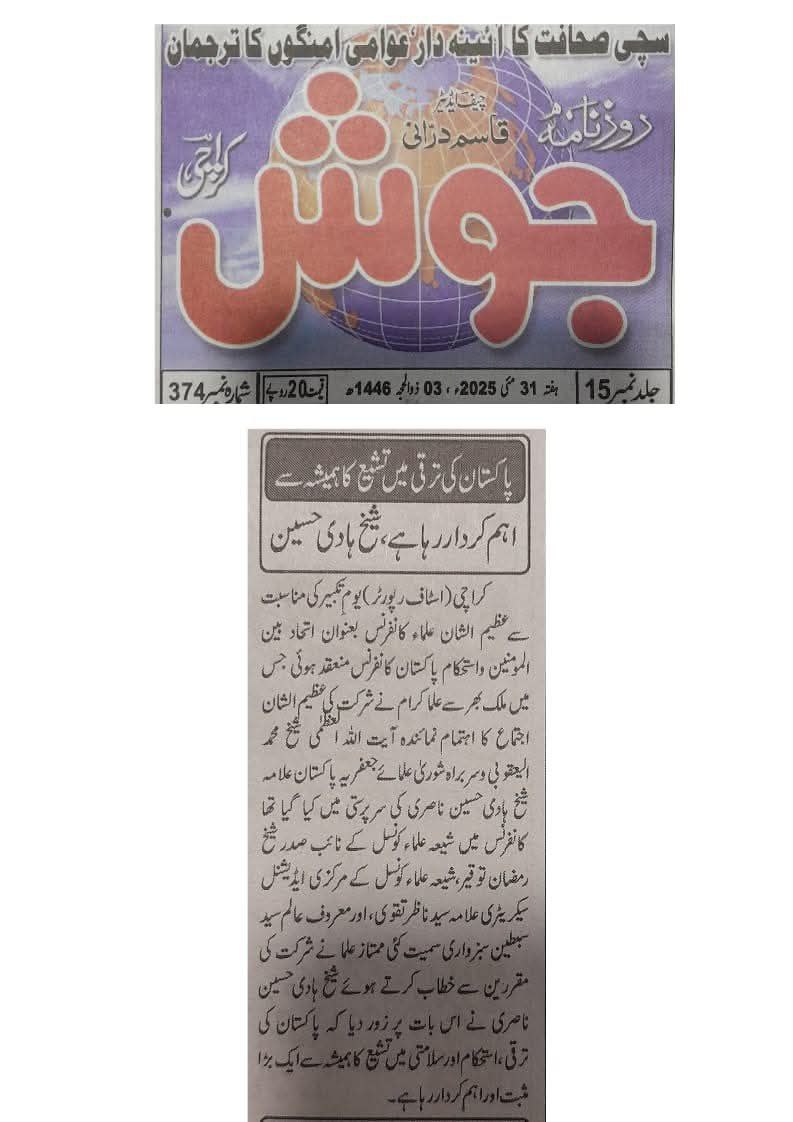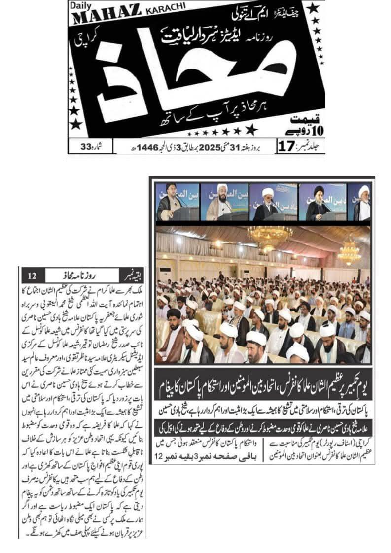 وقد نشرت هذه الصحف، خبر مؤتمر “بهکر” العلمائي الأخير، مبرزةً “أهميته الكبيرة، وما شهده من حضور علمائي وشعبي واسع”، مؤكدةً أن “مكتب المرجع اليعقوبي في باكستان، يلعب دوراً أساسياً في تعزيز اللحمة الوطنية ونشر القيم الإسلامية الأصيلة، بما يسهم في ترسيخ الوحدة والتآزر بين أبناء الوطن”.