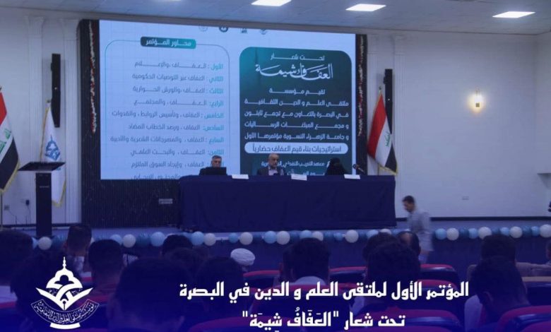 وذكر بيان للملتقى، تلقت “النعيم ينوز” نسخة منه، أنه “تحت عنوان: (العفاف شيمة).. أقام ملتقى العلم والدين- البصرة وبالتعاون مع: (تجمّع ثابتون ومجمع المبلغات الرساليات وجامعة الزهراء النسوية) المؤتمر العلمي المركزي الأول في #يوم_العفاف_العالمي بمناسبة ولادة السيدة زينب عليها السلام على قاعة معهد النفط”.