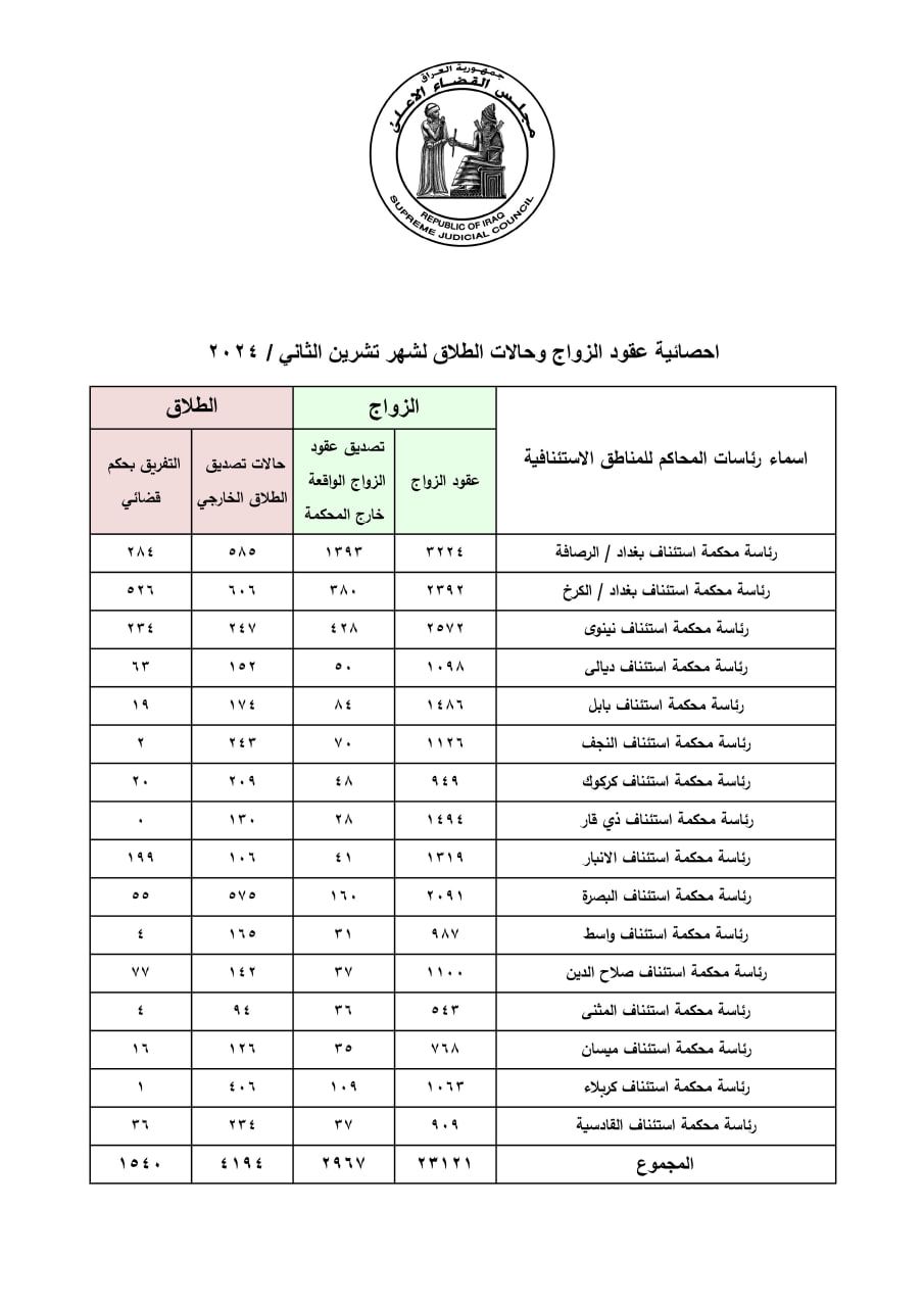 أعلن مجلس القضاء الأعلى، اليوم الثلاثاء، عن إحصائية رسمية لحالات الزواج والطلاق في العراق، خلال شهر تشرين الثاني الماضي.