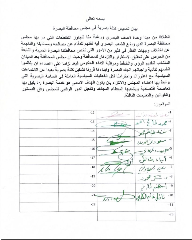 كشف عضو مجلس محافظة البصرة شكر العامري، اليوم الأحد، عن انسحاب تجمع العدالة والوحدة والذي يضم 3 أعضاء (بني عامر) من كتلة تصميم والدخول إلى كتلة بصرية في المجلس.