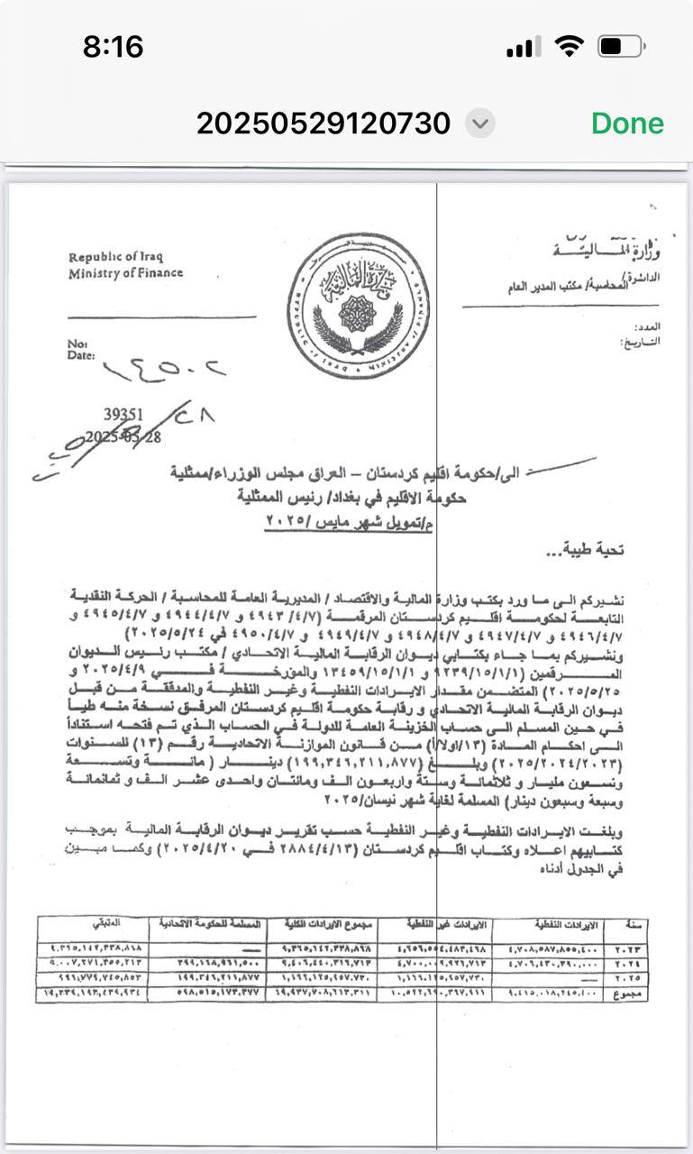 أصدرت وزارة المالية، اليوم الخميس، بياناً توضيحياً بشأن تعذر تمويل رواتب إقليم كردستان لشهر أيار.