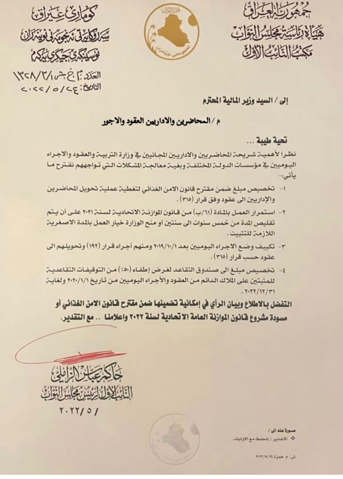 وذكر بيان لمكتب الزاملي تلقته “النعيم نيوز”. أن “وزير المالية استجابة لمخاطبة ومطالبة النائب الاول لرئيس مجلس النواب حاكم الزاملي بشأن تضمين التخصيصات اللازمة لتحويل المحاضرين والاداريين المجانيين في وزارة التربية الى عقود وفق قرار ٣١٥ وصرف الفروقات الكاملة لهم، وتكييف وضع الاجراء اليوميين وتحويلهم الى عقود”.