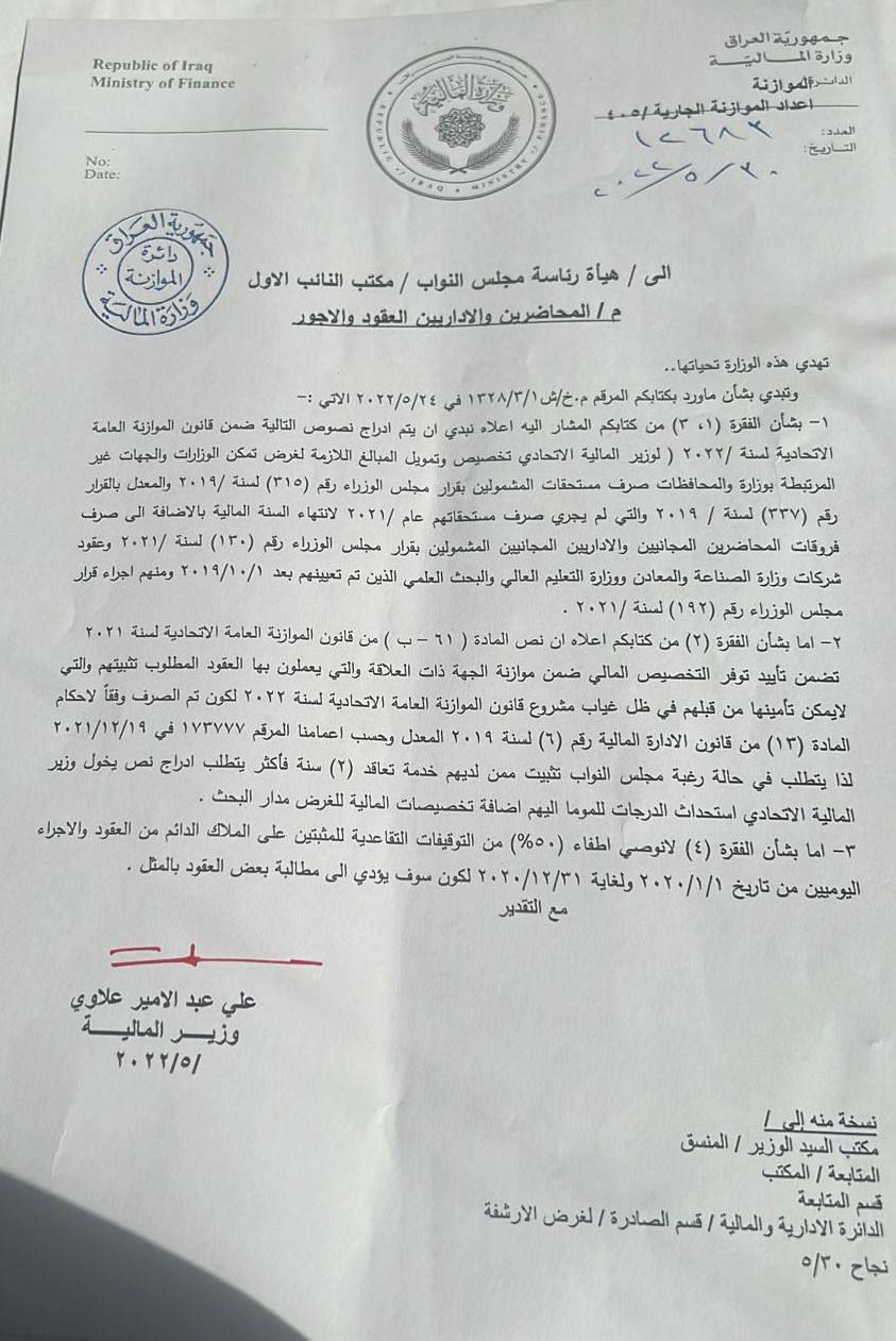استجاب وزير المالية علي عبد الأمير علاوي، اليوم الاثنين، لمخاطبة النائب الأول لرئيس مجلس النواب حاكم الزاملي؛ بشأن تضمين التخصيصات اللازمة لتحويل المحاضرين والاداريين المجانيين في وزارة التربية الى عقود.