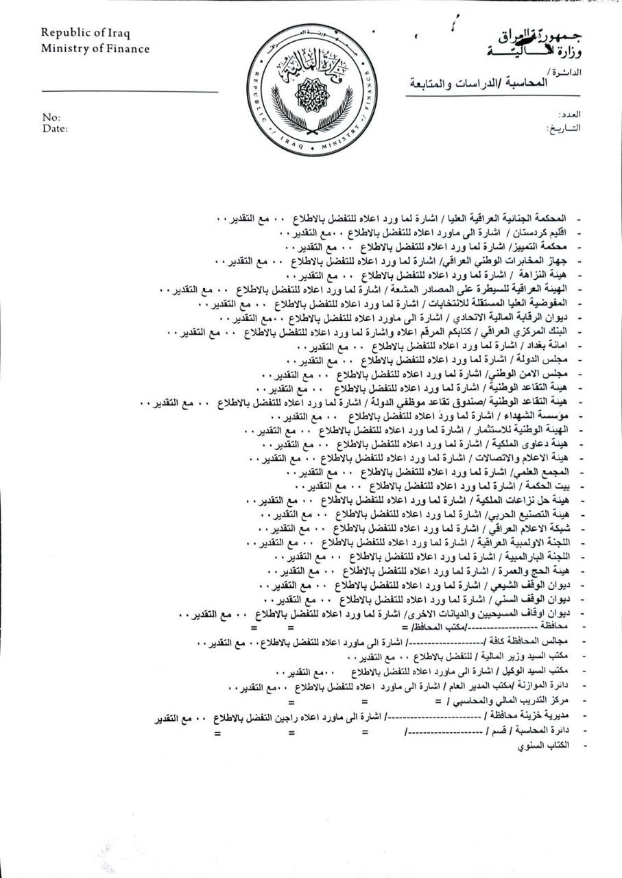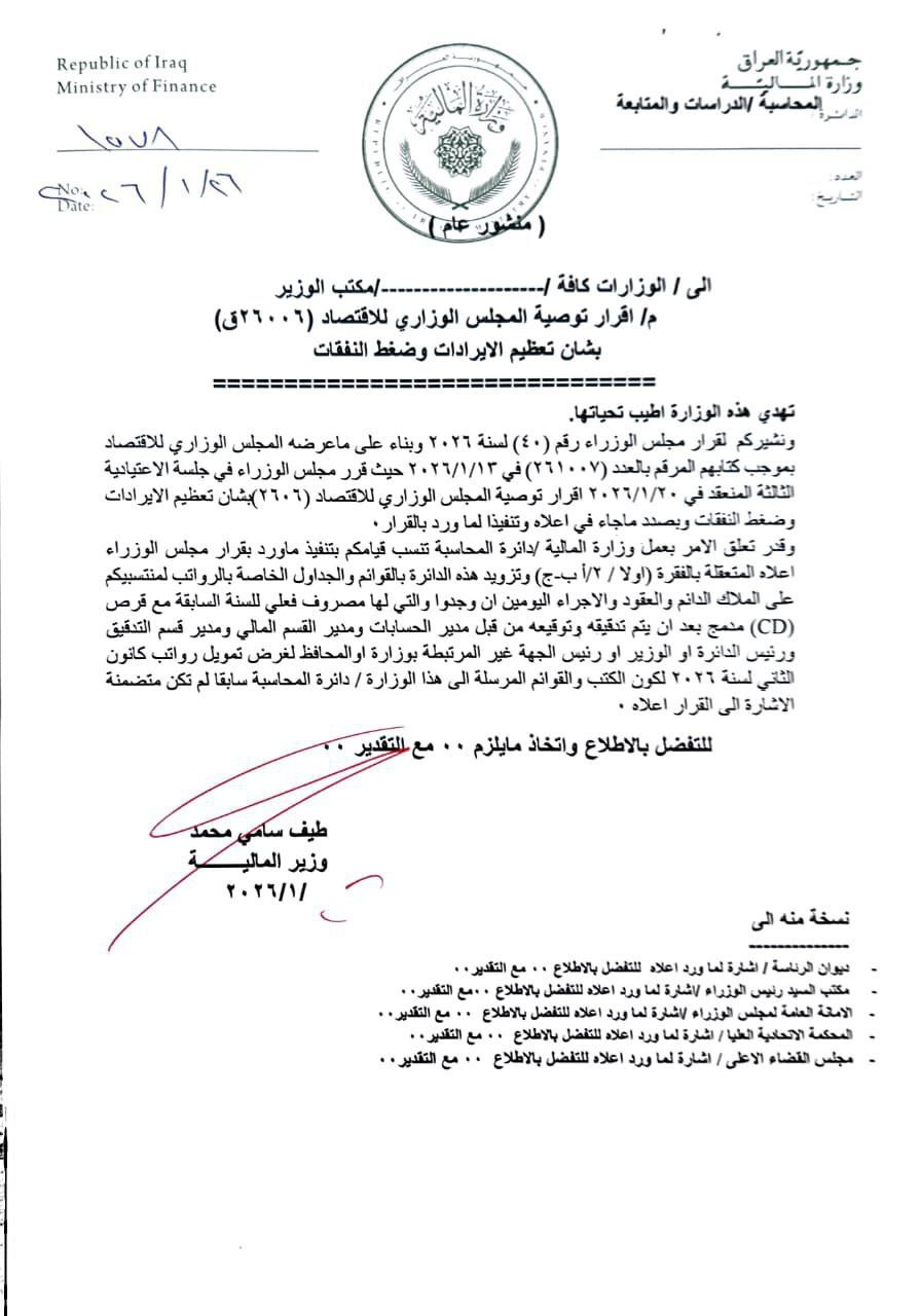 وتابع: “تنسب قيامكم بتنفيذ ما ورد بقرار مجلس الوزراء أعلاه المتعقلة بالفقرة (أولاً) / 2أ ب-ج)، وتزويد دائرة المحاسبة بالقوائم والجداول الخاصة بالرواتب لمنتسبيكم على الملاك الدائم والعقود والأجراء اليومين إن وجدوا، والتي لها مصروف فعلي للسنة السابقة مع قرص (CD) مدمج، بعد أن يتم تدقيقه وتوقيعه من قبل مدير الحسابات ومدير القسم المالي ومدير قسم التدقيق ورئيس الدائرة أو الوزير أو رئيس الجهة غير المرتبطة بوزارة أو المحافظ، لغرض تمويل رواتب كانون الثاني لسنة (2026)، لكون الكتب والقوائم المرسلة إلى هذا الوزارة / دائرة المحاسبة سابقاً لم تكن متضمنة الإشارة إلى القرار أعلاه”.