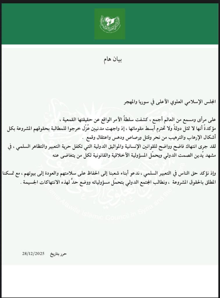 دعا المجلس الإسلامي العلوي الأعلى في سوريا والمهجر، اليوم الأحد، أبناء الطائفة العلوية إلى “الحفاظ على سلامتهم والعودة إلى بيوتهم”، مع تأكيده على التمسك “المطلق بالحقوق المشروعة”.