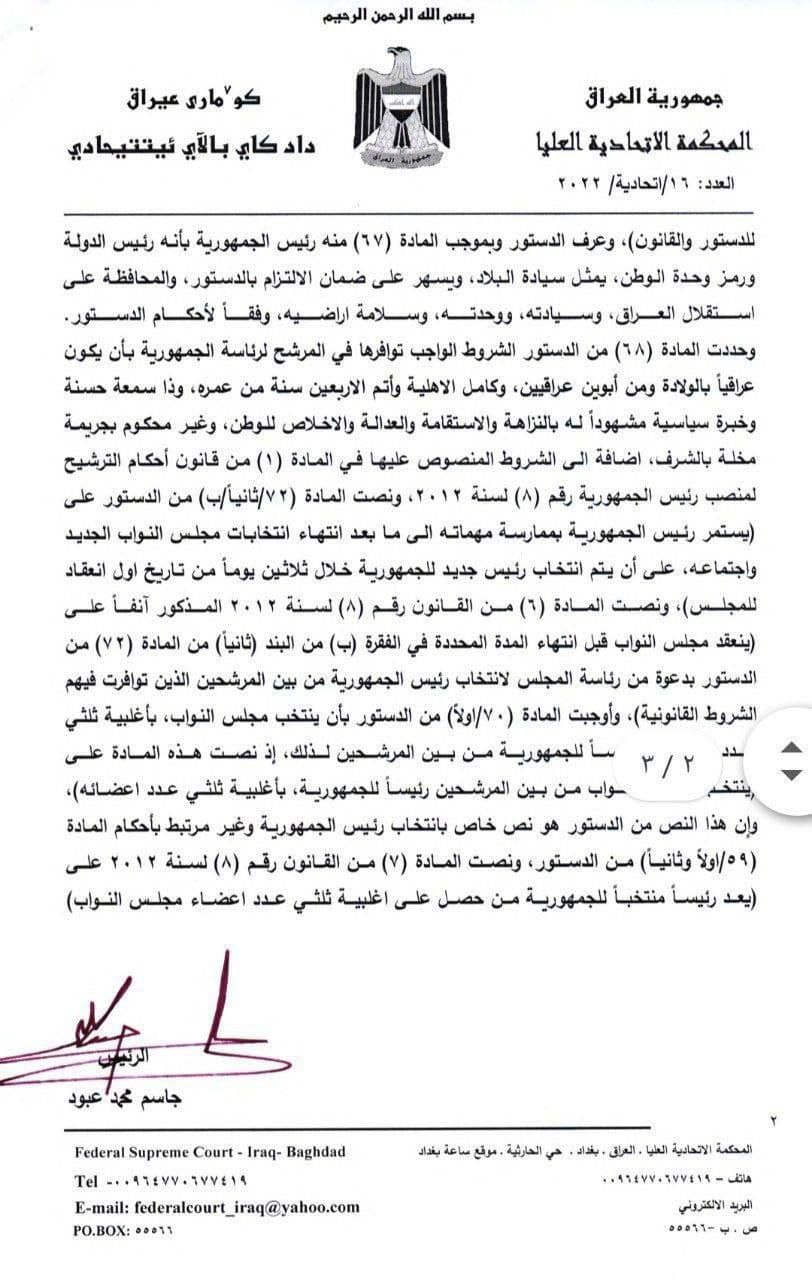 المحكمة الاتحادية توضح بخصوص المادة الدستورية الخاصة بانتخاب رئيس الجمهورية (الوثائق)