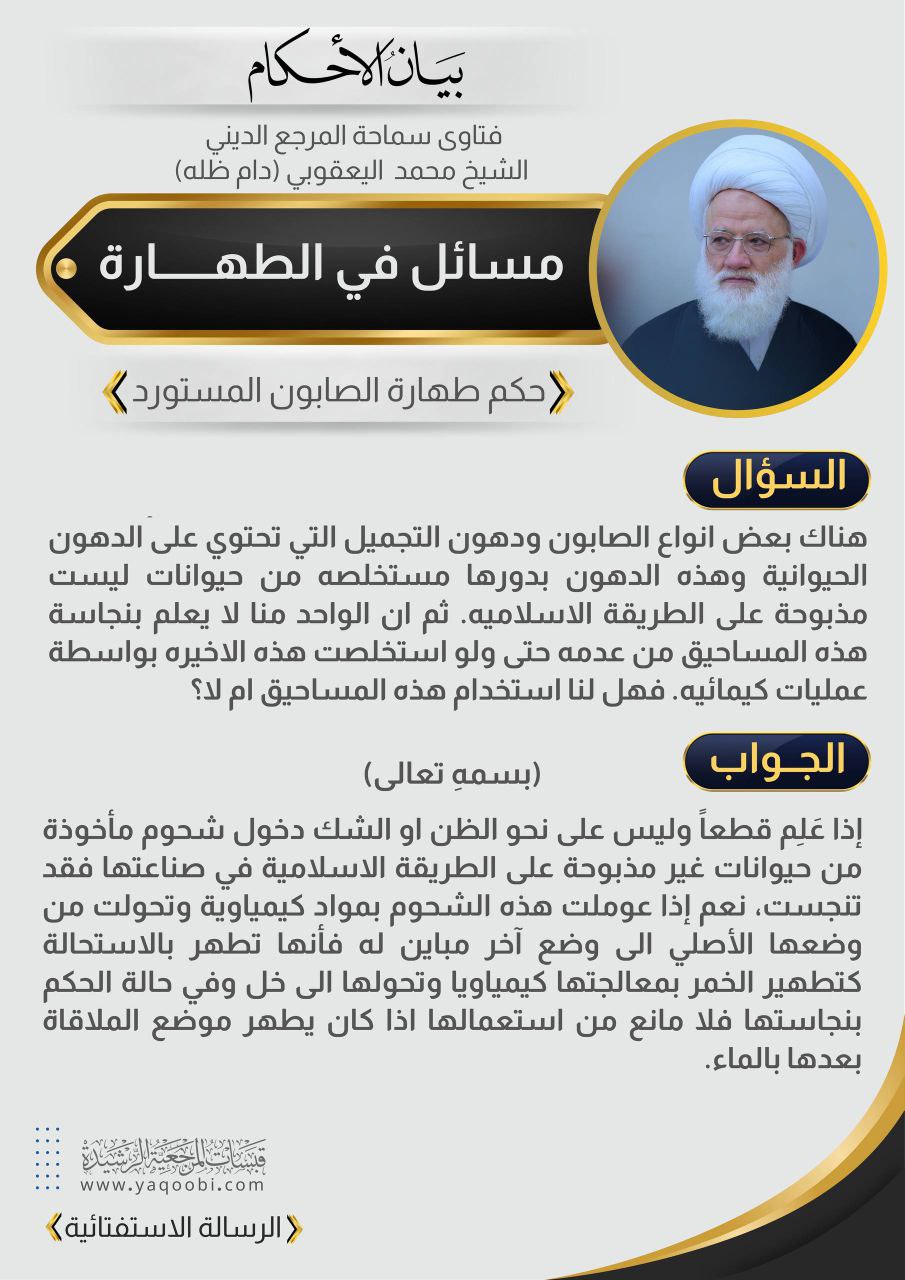 أجاب سماحة المرجع الديني الشيخ محمد اليعقوبي على استفتاء حول حكم طهارة الصابون المستورد.