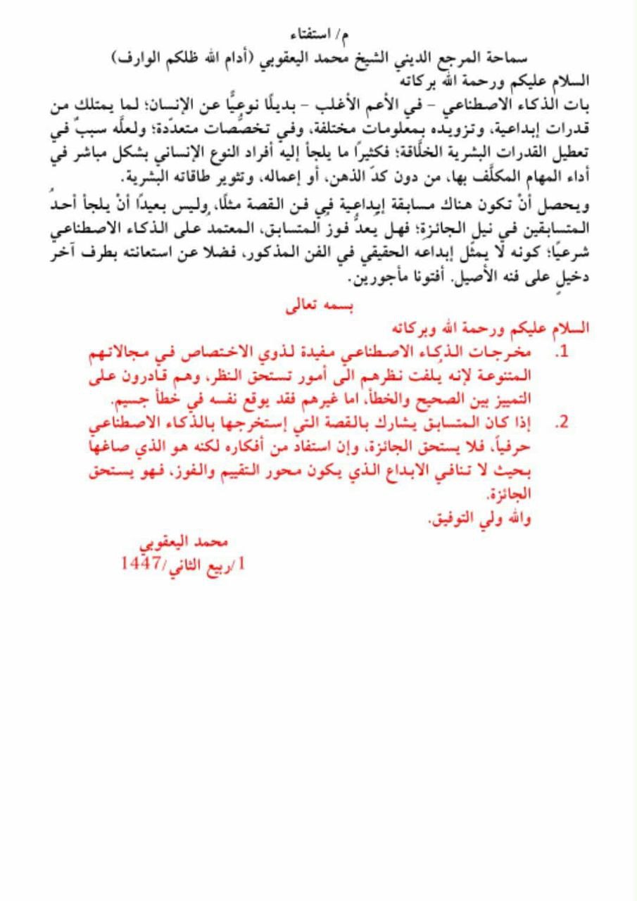 المرجع اليعقوبي يجيب عن استفتاء حول كيفية الاستفادة من الذكاء الاصطناعي