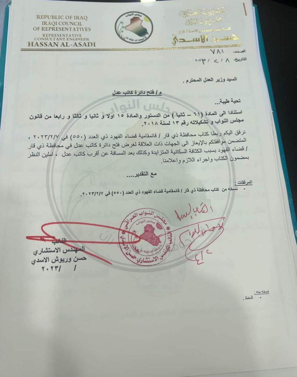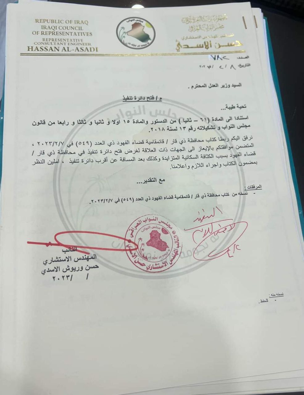 وفي نهاية اللقاء تم استحصال موافقة السيد الوزير على فتح دائرة كاتب عدل ودائرة التنفيذ في قضاء الفهود