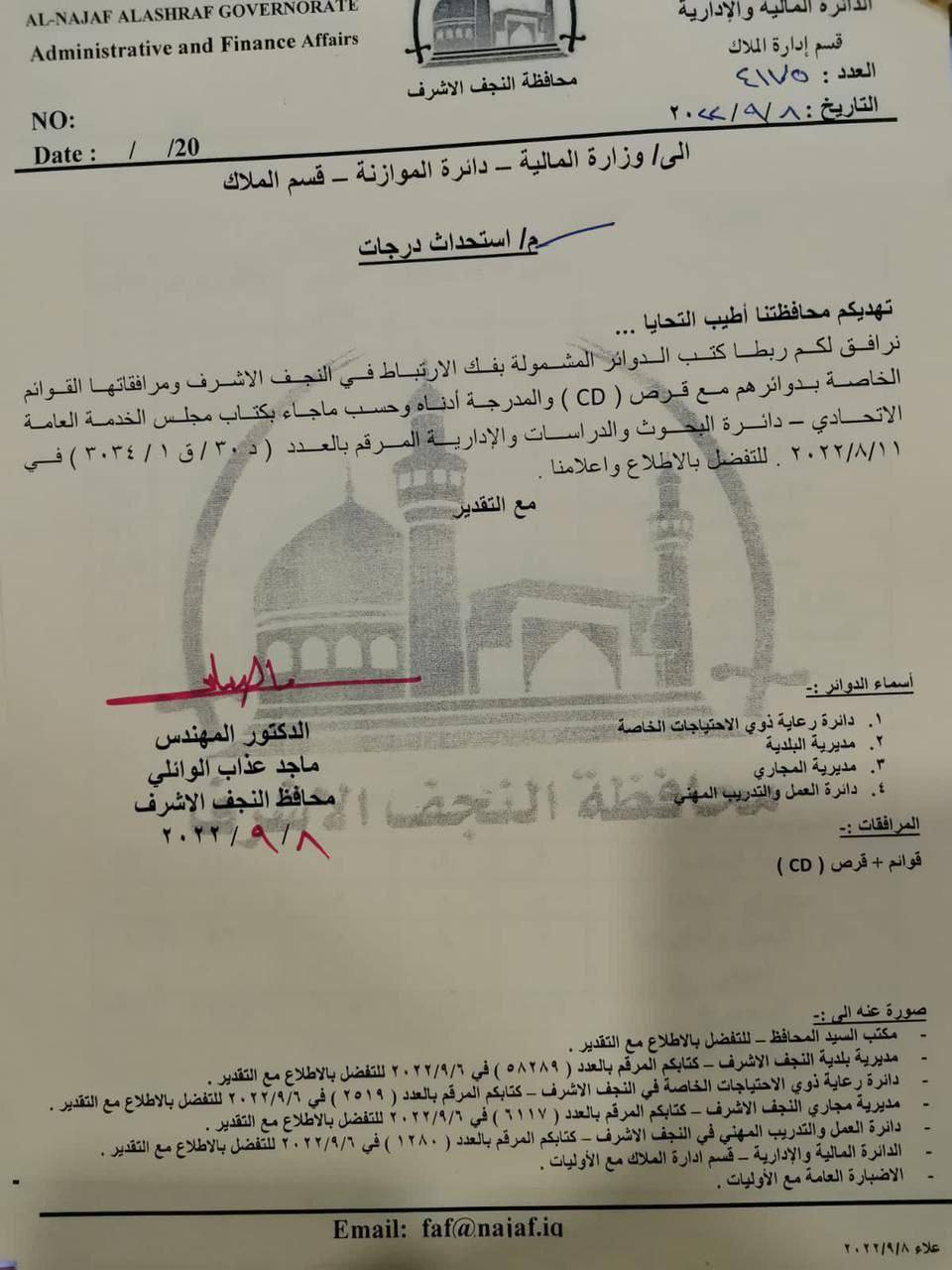النجف تعلن إنهاء الاحتياجات الوظيفية وترسل القوائم إلى المالية (الوثائق)