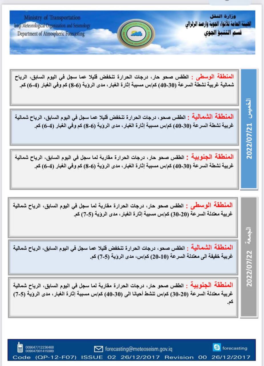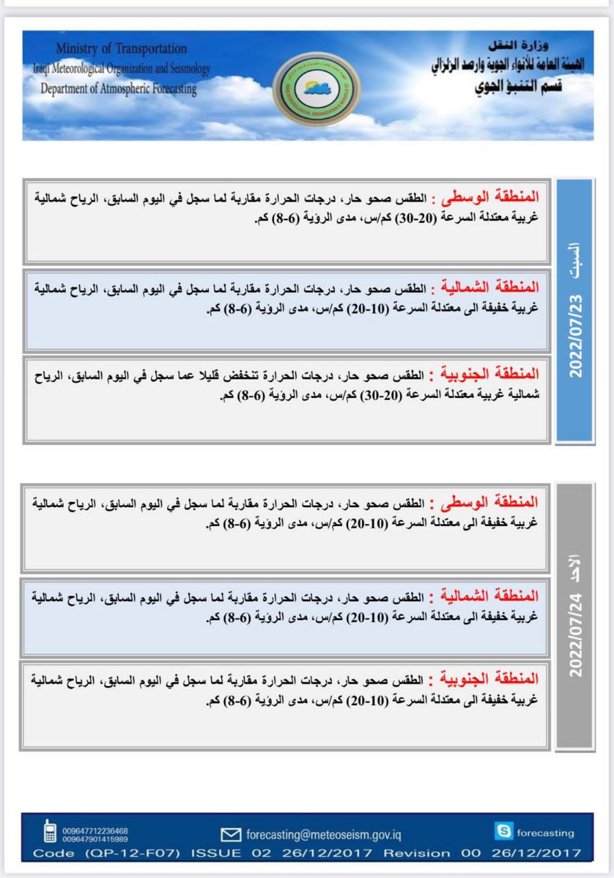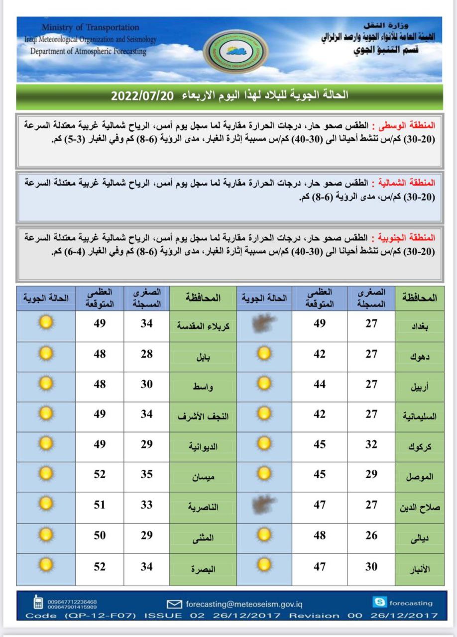 أعلنت وزارة النقل، عن الحالة الجوية لليوم الأربعاء والأيام التي تليه والصادرة من قسم التنبؤ الجوي في الهيئة العامة للأنواء الجوية والرصد الزلزالي إحدى تشكيلات وزارة النقل.