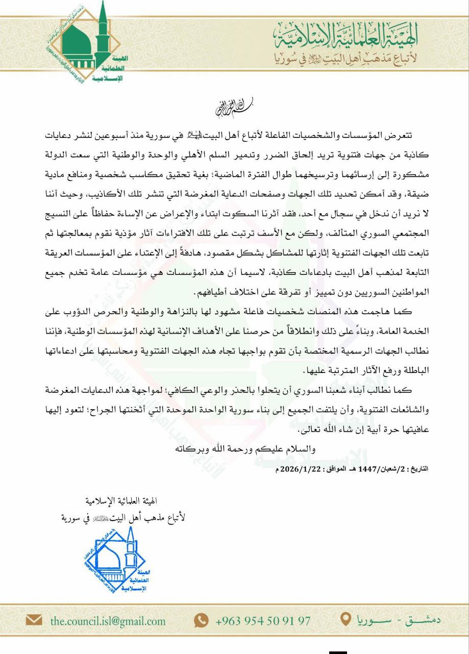 الهيئة العلمائية لأتباع مذهب أهل البيت (ع) في سوريا تصدر بياناً بشأن منشورات تحريضية