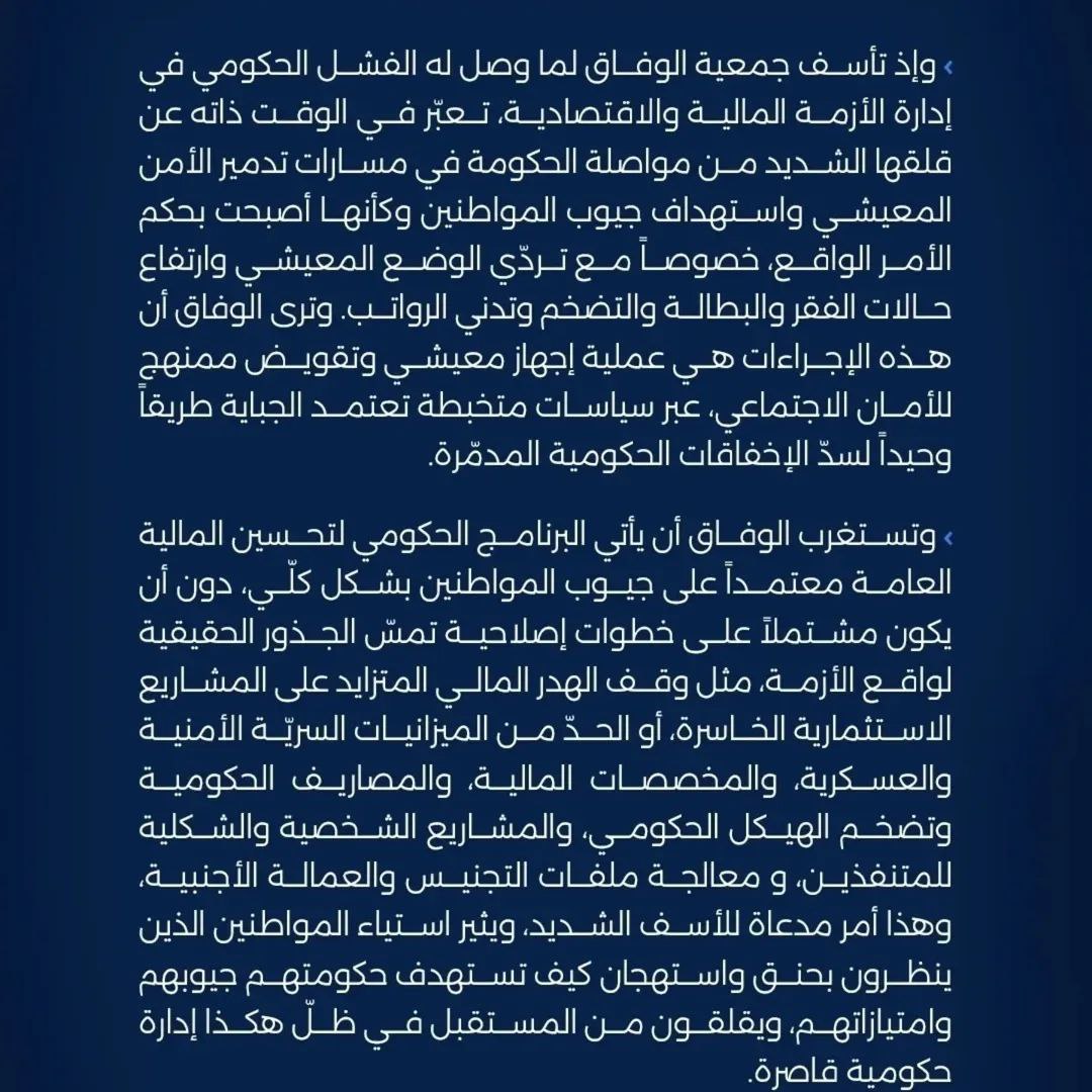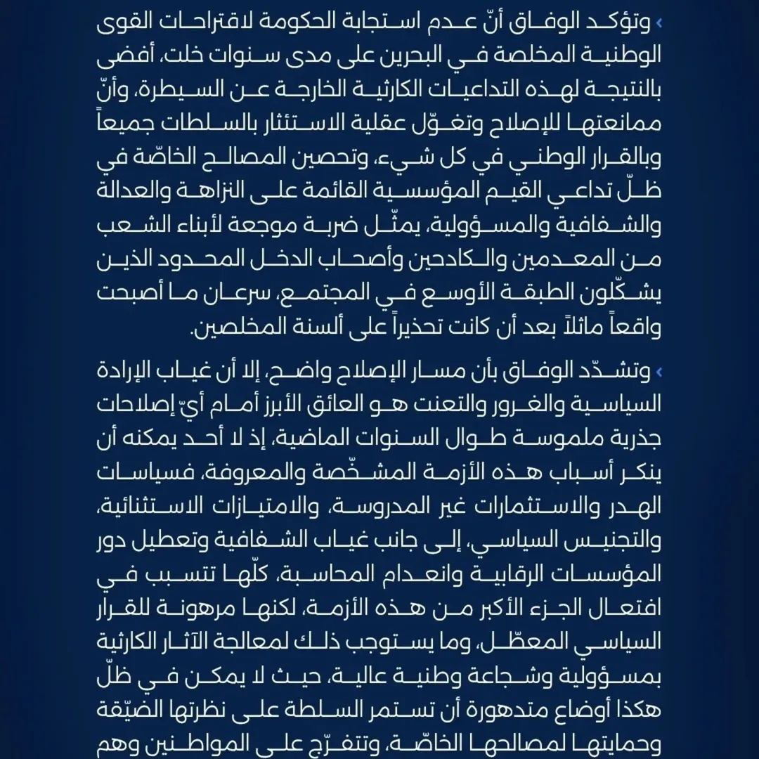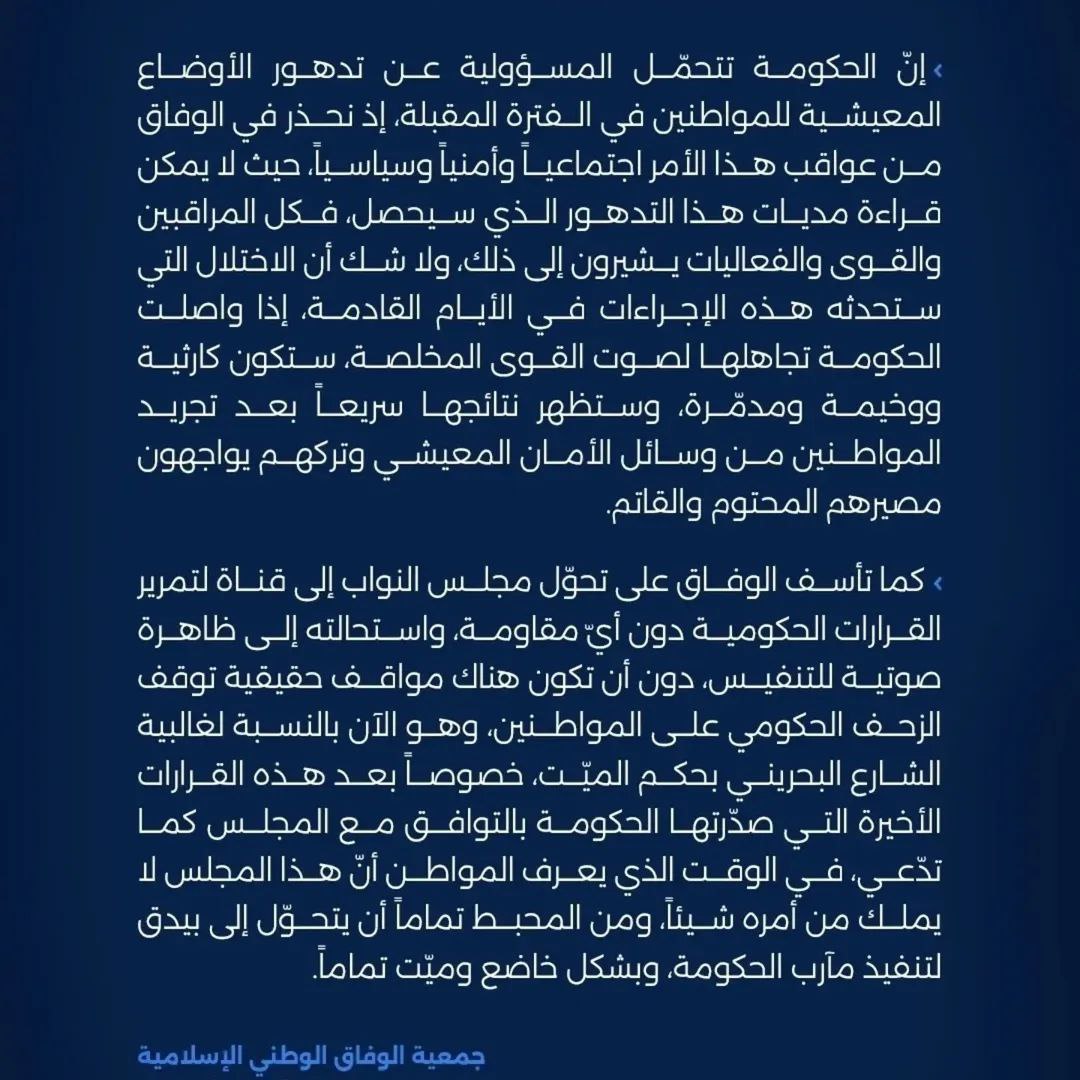 وحذّرت، من “عواقب إجراءات ما يسمى بتحسين المالية العامة”، معتبرة أن “كل ما جرى يكشف عدم كفاءة الحكومة وضعفها وتفردها بقرار البلد، والسير بها نحو نفق مظلم وانهيار كبير لدى الأسر البحرينية”.