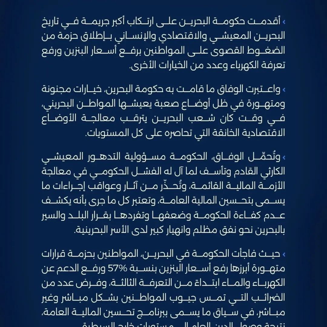 صرحت جمعية الوفاق الوطني الإسلامية المعارضة، اليوم الخميس، بأن حكومة البحرين، أقدمت على ارتكاب أكبر جريمة في تاريخ البلاد المعيشي والاقتصادي والإنساني، بإطلاق حزمة من الضغوط القصوى على المواطنين، برفع أسعار البنزين وتعرفة الكهرباء.