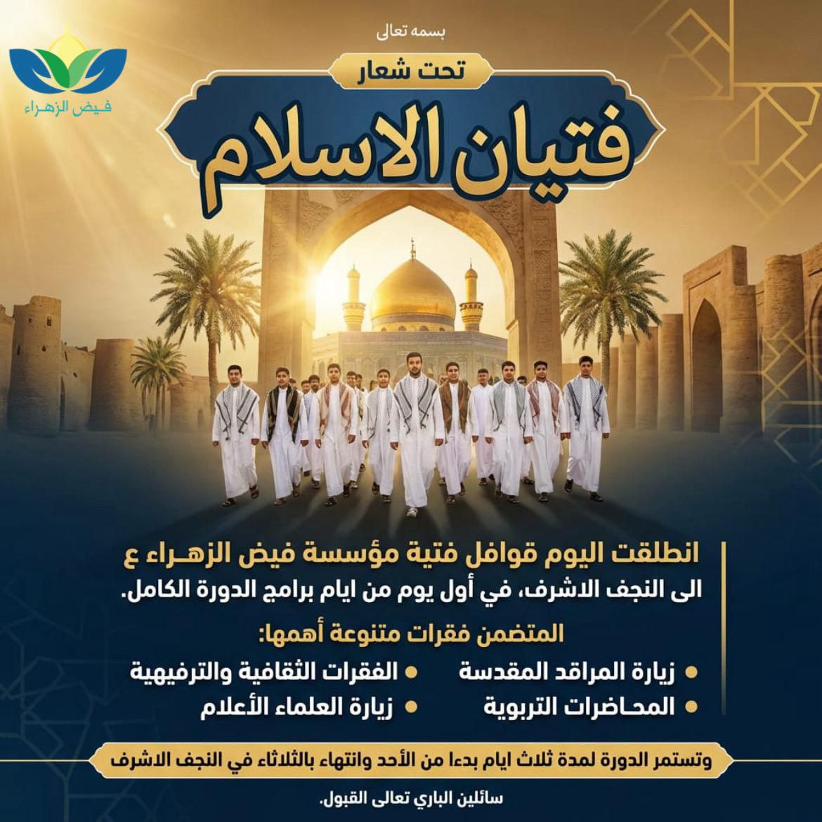 انطلقت اليوم الأحد، قوافل فتية مؤسسة “فيض الزهراء (ع)” متجهة نحو مدينة النجف الأشرف، للمشاركة في دورة تربوية وإيمانية مكثفة تستمر 3 أيام، وذلك تحت شعار “فتيان الإسلام”.