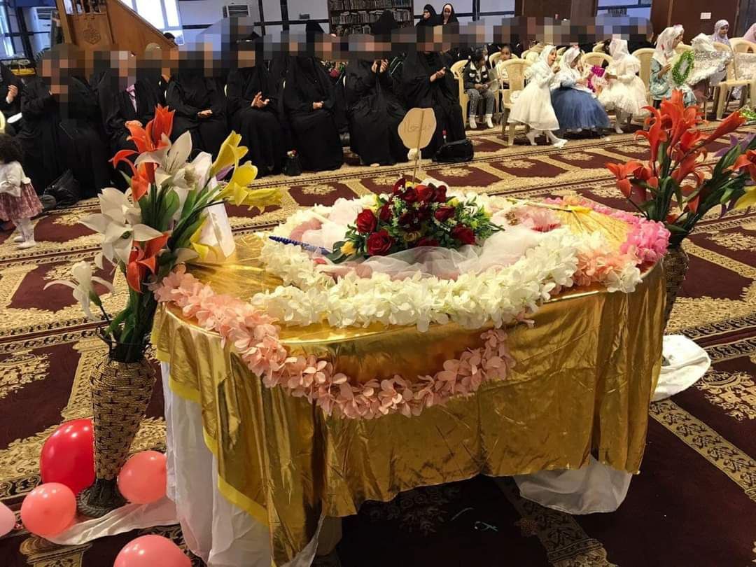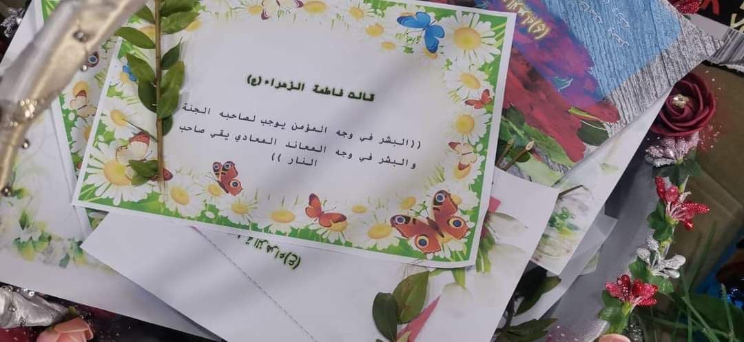 واضاف البيان فقرة رسائل الزهراء (ع ) إلى بناتها قامت بها مديرة المجمع آمنة الساعدي وتكريم مديرة مجمع الكاظمية العلوية صفية الجيزاني ومديرة جامعة الزهراء (ع) فرع الشعلة الاستاذة سهام الظلال ومديرة معهد الزهراء (ع) الاستاذة حمدية العقيلي وتكريم الطالبات المشاركات بتلخيص البحث الفاطمي لهذه السنة وتكريم الطالبات اللواتي شاركن بمشهد ولادة بضعة الرسول الاعظم وتكريم الطالبات اللواتي شاركن بقصة الهداية والضلال. وتكريم معاونة المجمع الميدانيه امل الموسوي.