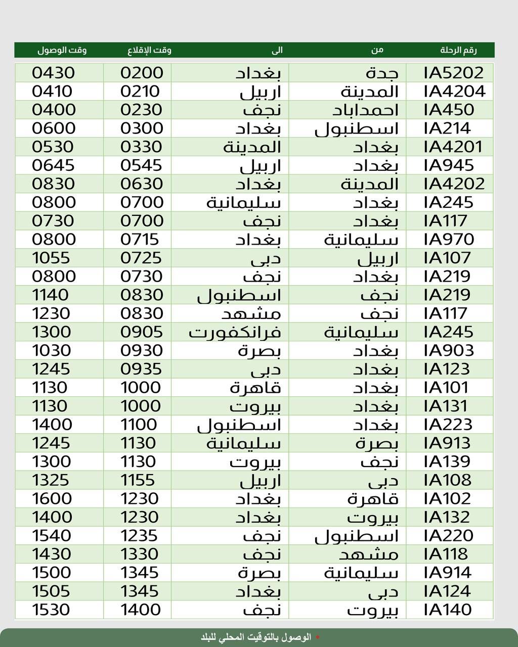 أعلنت الخطوط الجوية العراقية، اليوم الأربعاء، عن جدول رحلاتها ليوم غد.