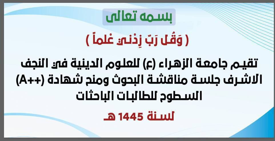 أعلنت جامعة الزهراء (ع) للعلوم الدينية في مدينة النجف الأشرَف، اليوم الثلاثاء، عن إقامة جلسة مناقشة البحوث ومنح شهادة (++A) السطوح للطالبات الباحثات، لسنة 1445 هجرية.