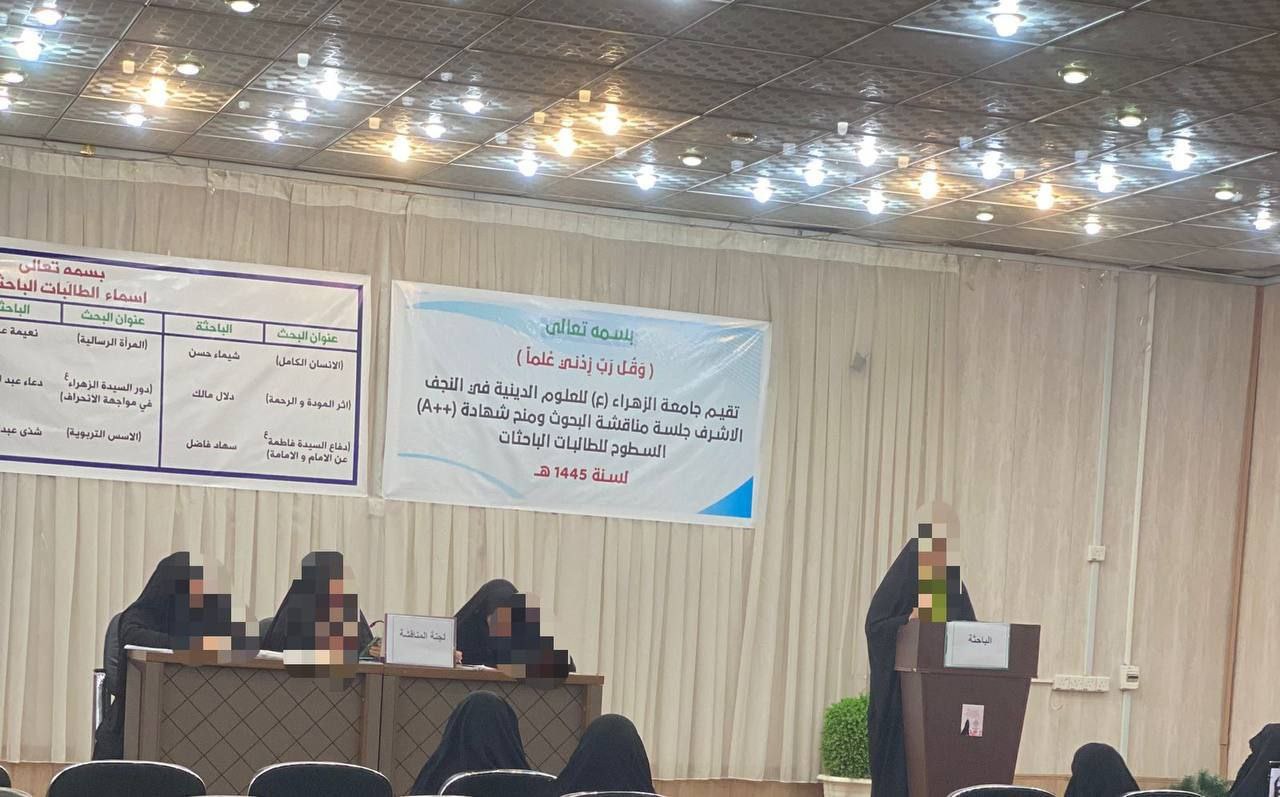 وأفاد بيان للجامعة، تلقت “النعيم نيوز” نسخة منه، أنه “بتوفيق من الله تعالى وببركة الزهراء البتول (ع)، انعقدت يوم ١٩ ج١، في جامعة الزهراء (ع) للعلوم الدينية في النجف الأشرف، الجلسة الأولى لمناقشة بحوث تخرج الطالبات لنيل شهادة ++A (شهادة السطوح)، والتي تعادل شهادة البكالوريوس“.
