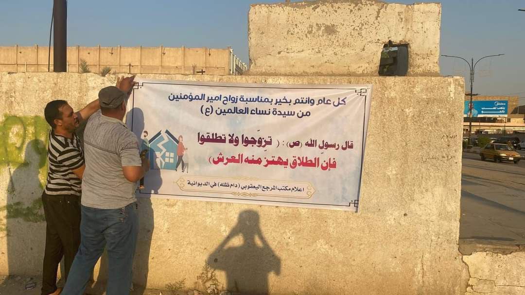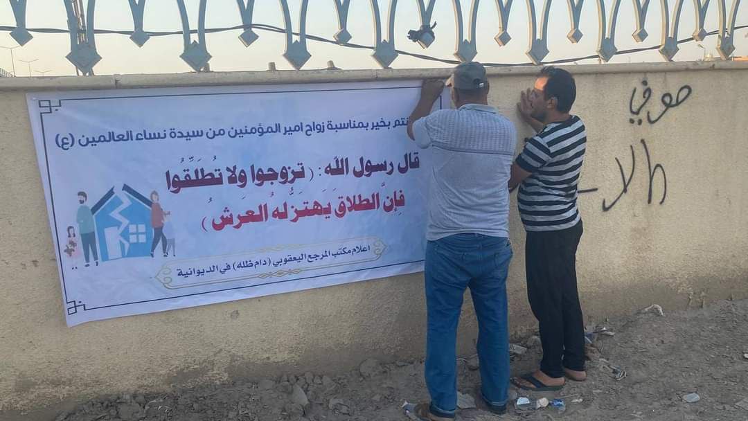 وقال مسؤول الحملة، الشيخ عباس التميمي، بحسب البيان، إن “كوادر مكتب المرجعية، قامت بحملة توعية للحد من ظاهرة الطلاق والتفكك الأسري، بمناسبة زواج النور من النور، بنشر بوسترات في الأماكن المهمة في مركز محافظة الديوانية، نظراً لما يعانيه المجتمع من كثرة حالات الطلاق”.