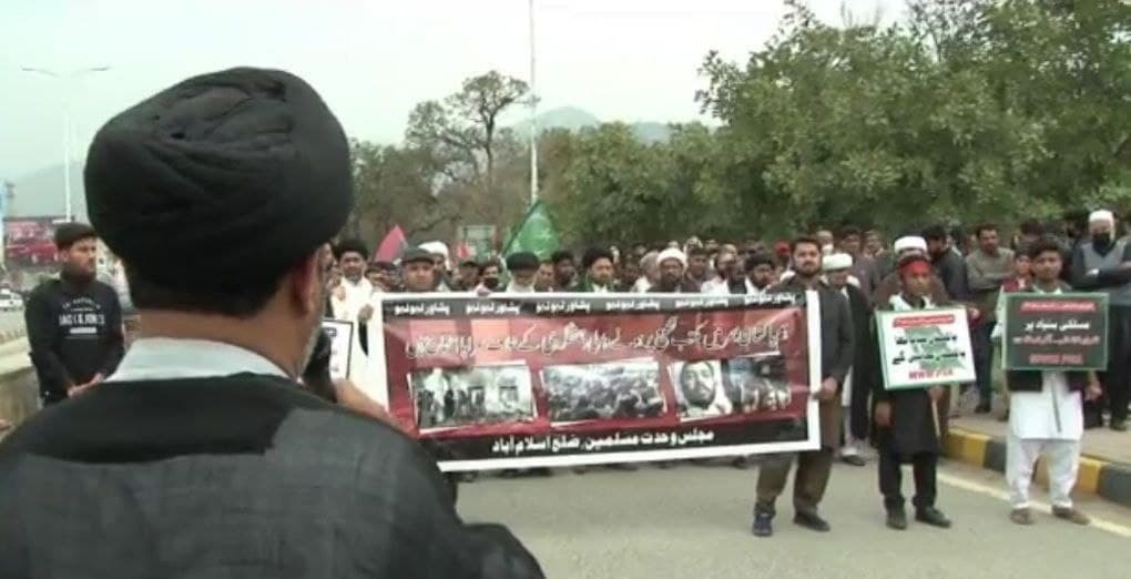 نظم مجلس وحدة المسلمين، اليوم الاثنين، مظاهرات واسعة في مختلف أنحاء باكستان، وأبرزها العاصمة إسلام آباد، وذلك احتجاجاً على المجزرة الإرهابية التي استهدفت مسجد الإمامية المركزي في مدينة بيشاور.