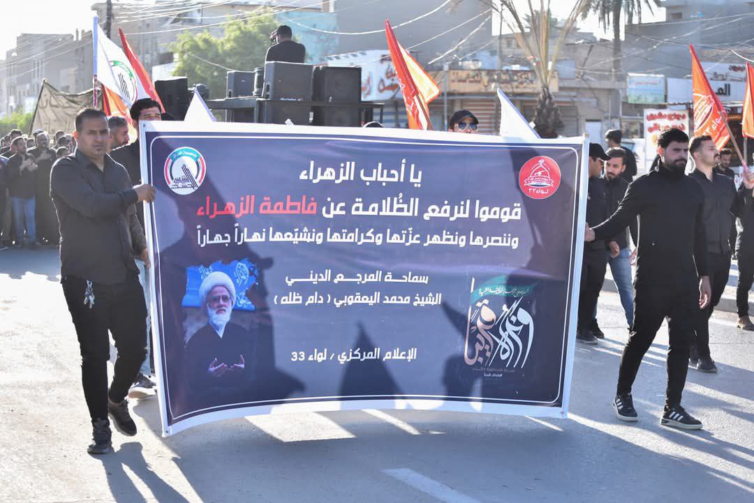 وذكرت ممثلية المرجعية، في بيان تلقت “النعيم نيوز” نسخة منه، أنه “في أجواءٍ مفعمة بالحزن والأسى، شهدت مدينة الشعلة ببغداد، إقامة مراسيم التشييع الرمزي لنعش الصديقة الزهراء (ع)، والذي أقامته ممثلية سماحة المرجع الديني الشيخ محمد اليعقوبي في الشعلة، بمشاركة جمع من فضلاء الحوزة العلمية والوجهاء والأساتذة الأكاديميين والشخصيات الاجتماعية والقيادات العسكرية من الحشد الشعبي والنساء المؤمنات، ومدارس الأشبال”.