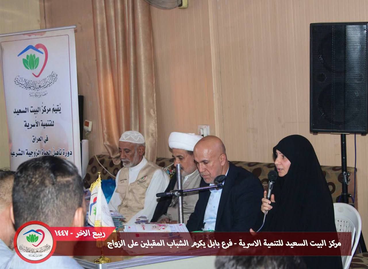 من جانبه، تحدث السيد عبد الرحمن خلف، مسؤول ملتقى العلم والشباب، بحضور مدير فرع بابل الشيخ سامي المعموري وعدد من الأعضاء، وكذلك المبلّغة أم أحمد من مركز البيت السعيد، عن “أهمية الزواج وبناء العش الزوجي، وما يحمله من إيجابيات في ترسيخ الاستقرار الأسري والاجتماعي”.