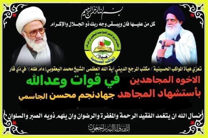 قدّم وفد من مكتب سماحة المرجع الديني الشيخ محمد اليعقوبي (دام ظله) في ذي قار، اليوم الأربعاء، تعازيه ومواساته الخالصة لذوي الشهيد (جهاد نجم محسن) في قوات وعد الله لواء ٣٣.