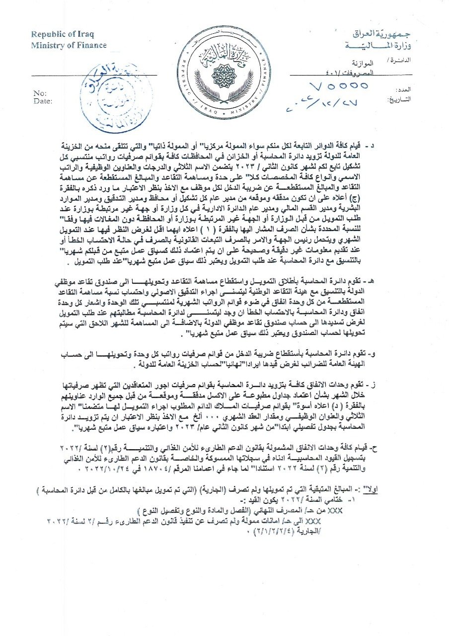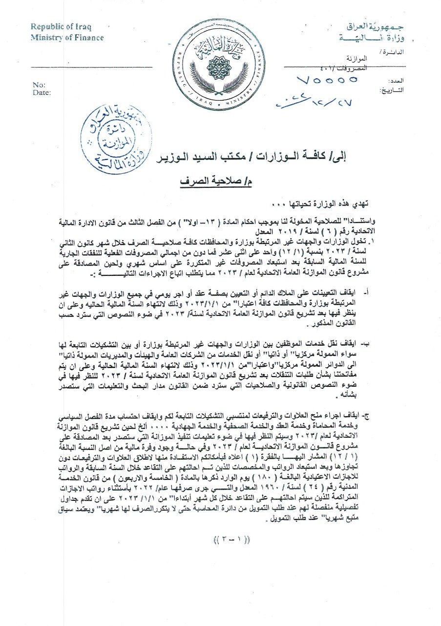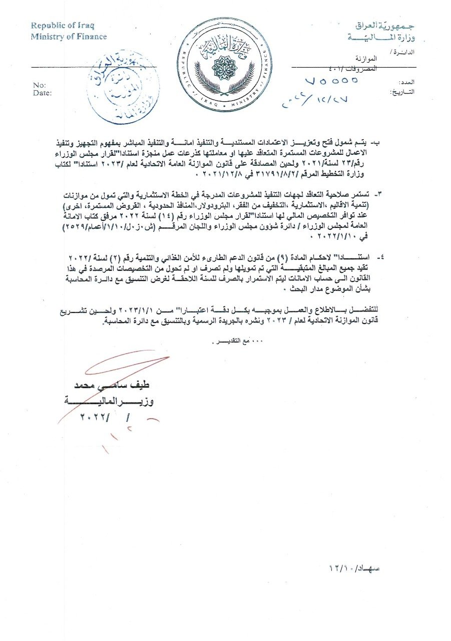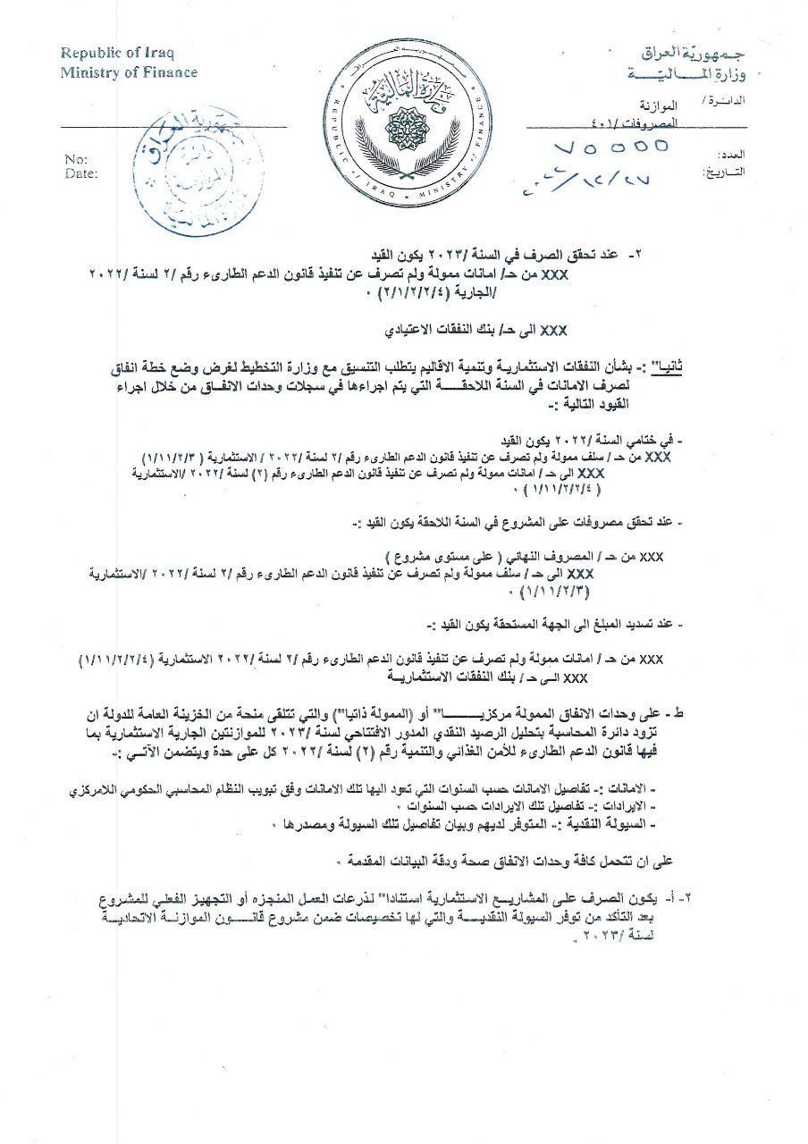 وأشارت، إلى أن “تنظيم الأمور المالية والقانونية سيكون وفق نسبة الصرف ١٢/١، لحين تشريع قانون الموازنة الاتحادية العامة لسنة (٢٠٢٣)”.