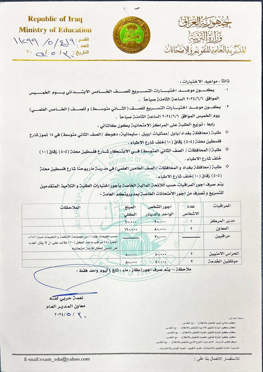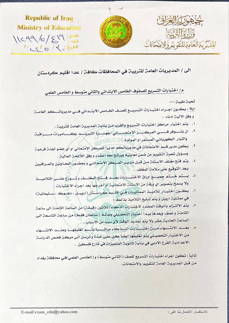 وذكر بيان للوزارة، تلقت “النعيم نيوز” نسخة منه، أن “المديرية العامة للتقويم والامتحانات، حددت آلية ومواعيد إجراء اختبارات التسريع، للصفوف للخامس الابتدائي والثاني متوسط والخامس العلمي، وكما موضح في الكتاب المرافق أدناه: