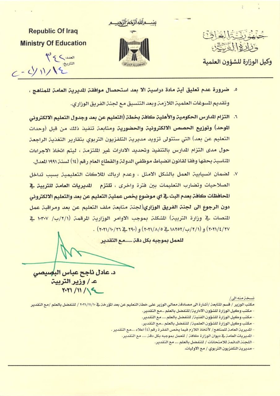 ووفقا للوثيقة، فذلك “لضمان انسيابية العمل بالشكل الأمثل فضلا عن تلافي الارباك الذي قد يحصل وينعكس سلباً على ابنائنا التلاميذ والطلبة بصورة عامة”.