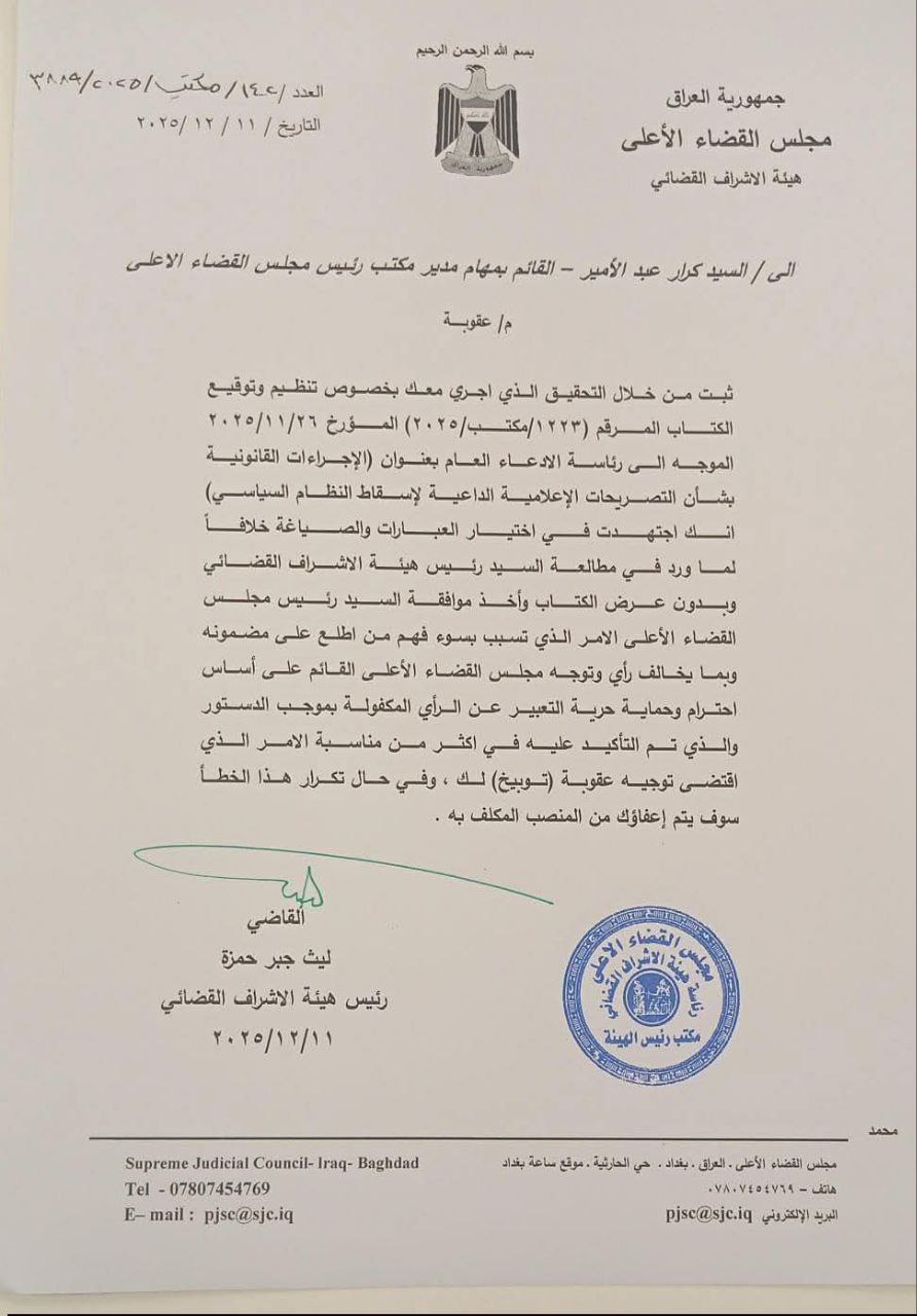 ووفقاً لوثيقة رسمية، موقعة من القاضي ليث جبر حمزة، رئيس هيئة الإشراف القضائي، والموجهة إلى كرار عبد الأمير، القائم بمهام مدير مكتب رئيس المجلس، وحصلت “النعيم نيوز” على نسخة منها، فإن “التحقيق أثبت تنظيمه وتوقيعه كتاب موجه إلى رئاسة الادعاء العام، بعنوان: (الإجراءات القانونية بشأن التصريحات الإعلامية الداعية لإسقاط النظام السياسي)، بصيغ ومصطلحات مخالفة لدراسة رئيس الهيئة، وبدون أخذ موافقة رئيس مجلس القضاء الأعلى”.