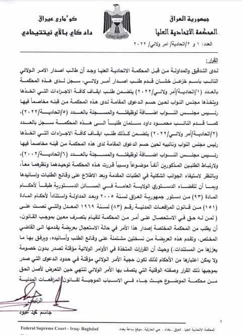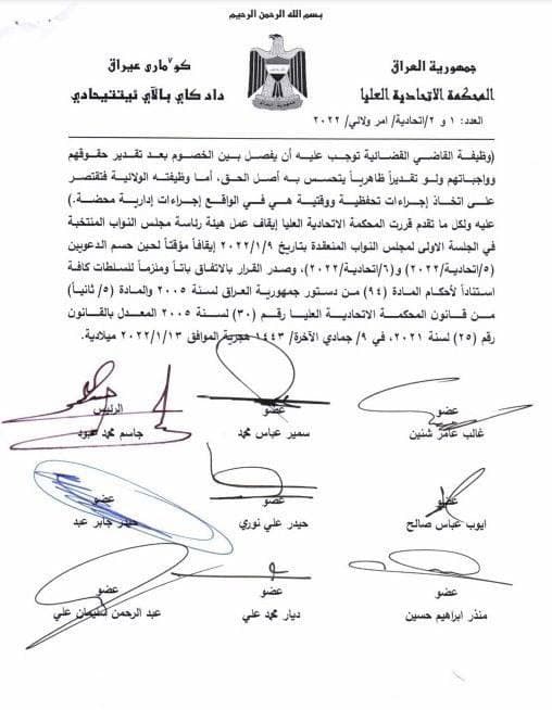 بالوثيقة.. المحكمة الاتحادية تقرر إيقاف عمل هيئة رئاسة البرلمان المنتخبة مؤقتاً