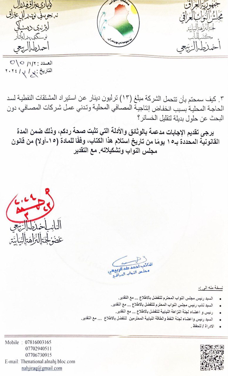 واردف، أن”فشل واخفاقات مدير شركة توزيع المنتجات النفطية مدعاة لاستجوابه وسحب الثقة عنه في القريب العاجل”.