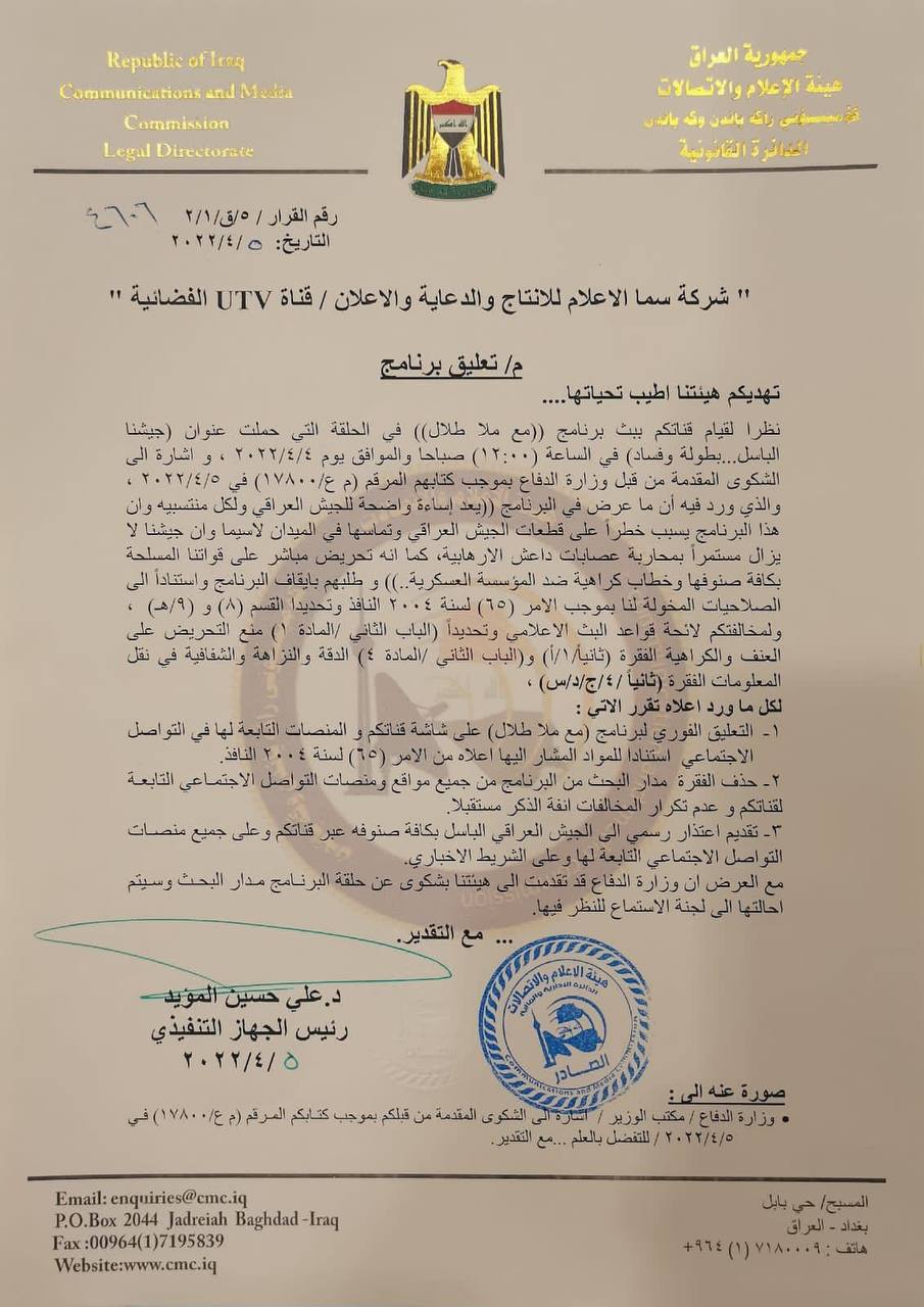 بالوثيقة.. هيئة الاعلام تعلق برنامج مع الملا طلال وتطالبه باعتذار رسمي للجيش العراقي!