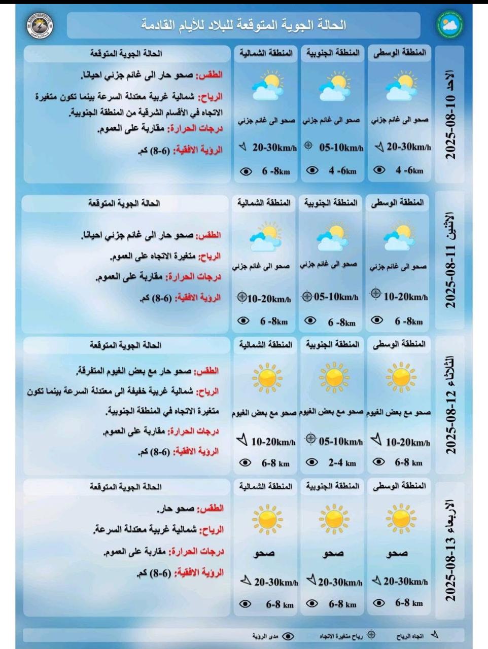 وذكرت الهيئة، في بيان تلقت “النعيم نيوز” نسخة منه، أن “طقس يوم غد الأحد سيكون صحواً إلى غائم جزئي، ودرجات الحرارة مقاربة لليوم السابق”، مضيفة أن “طقس يوم الاثنين المقبل، سيكون صحواً حاراً إلى غائم جزئي، ودرجات الحرارة مقاربة لليوم السابق”.