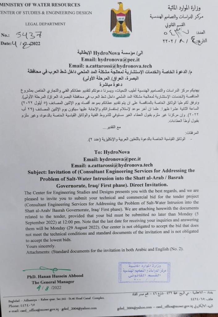 ووفقاً لوثائق، حصلت “النعيم نيوز” على نسخة منها، فإن “الوزارة، قدمت كتب رسمية لثلاث شركات، شملت Energoprojekt الصربية وشركة Deltares الهولندية وشركة Hydronova الإيطالية”، مضيفة “لتقديم عطاءاتها مباشرة لمعالجة اللسان الملحي في شط العرب، وإقامة سد تنظيمي لمنع امتداد اللسان الملحي ضمن المرحلة الأولى”.