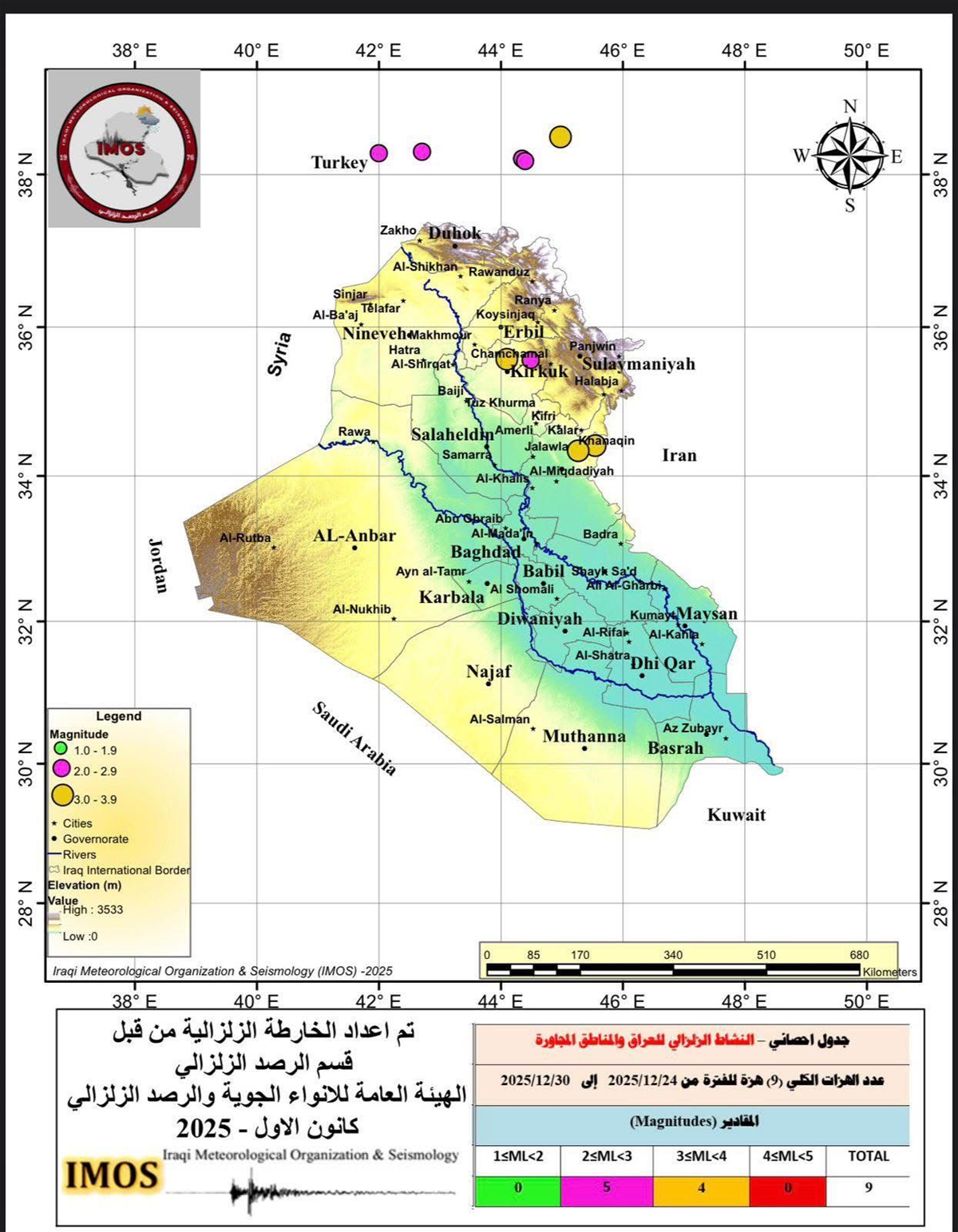 وأوضح، أن “4 من هذه الـ9 هزات، وقعت في الأراضي العراقية“، منوهاً إلى أن “قوة الهزات تراوحت بين 2.3 -3.5 درجة على مقياس ريختر“.