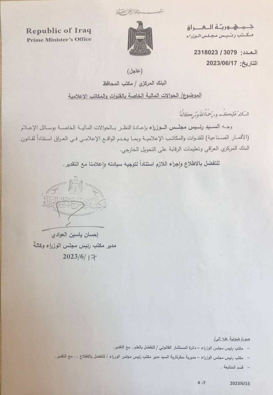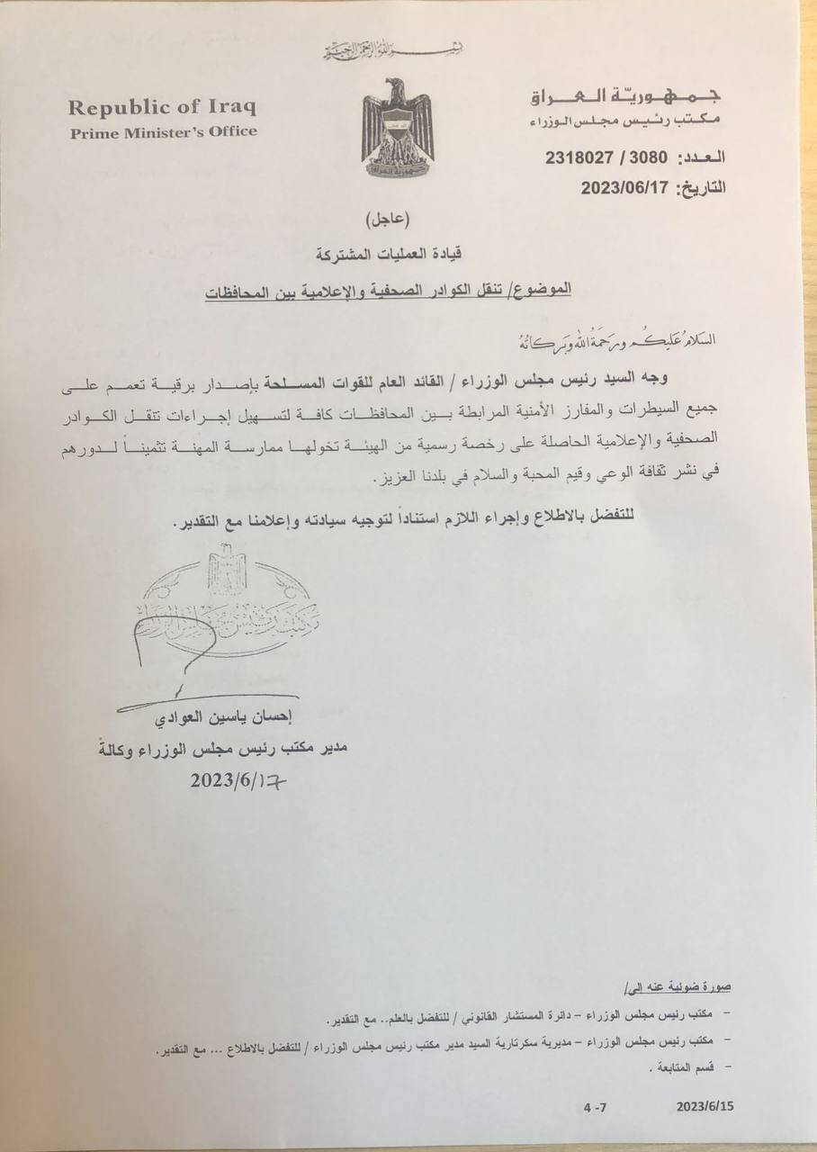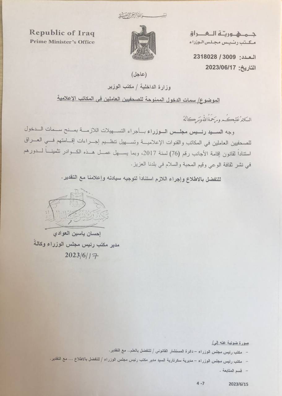 وجه رئيس مجلس الوزراء، محمد شياع السوداني، بإصدار حزمة من التوجيهات الخاصة بتسهيل عمل الصحفيين العراقيين والمؤسسات الإعلامية.